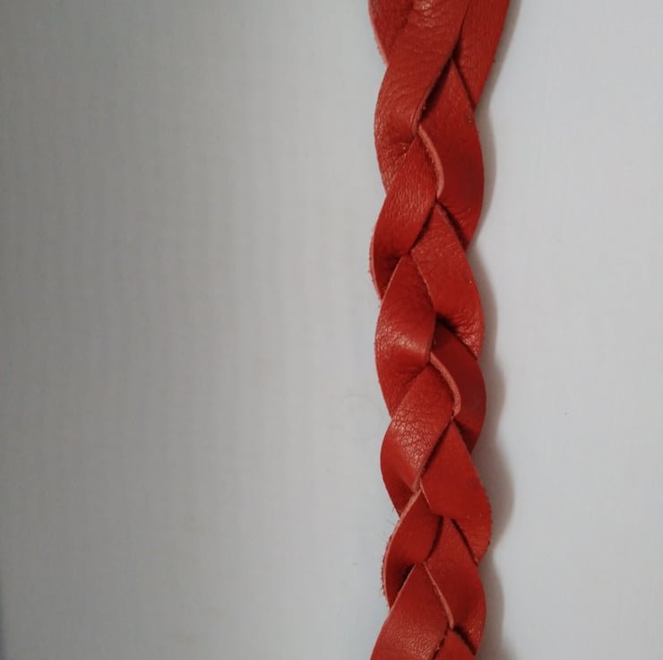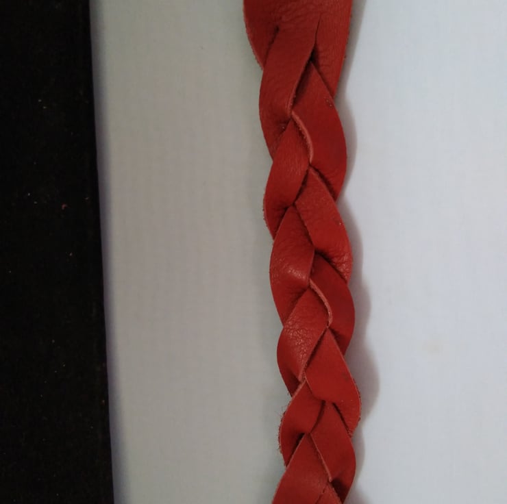 Here we have a tan leather braided bracelet/cuff. It measures 8 inches/20cm long and 1.25 inches/3cm wide. Made from a soft supple leather and finished with a gunmetal coloured press stud.