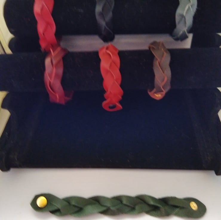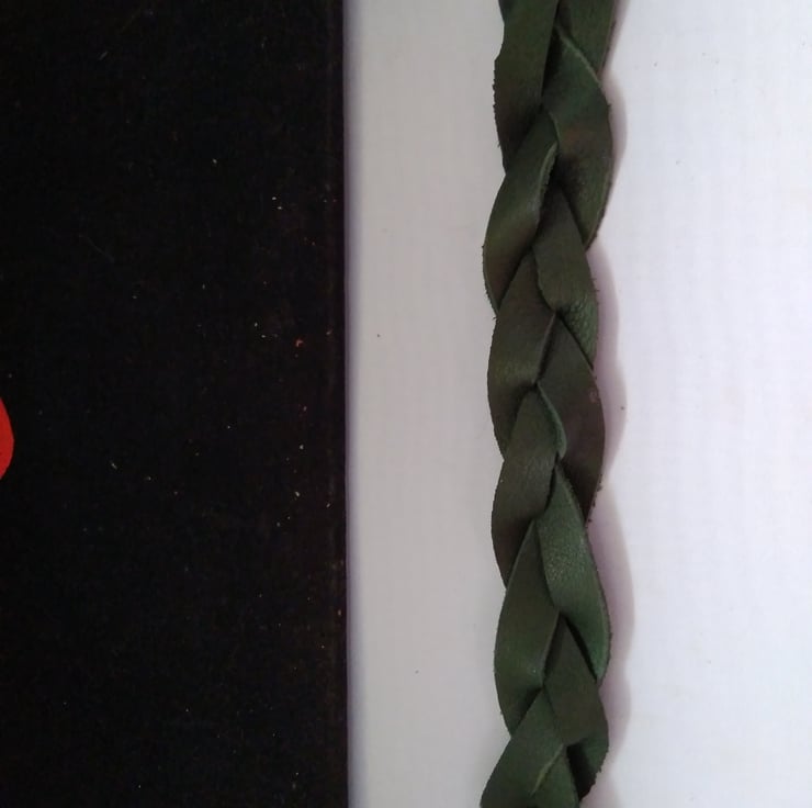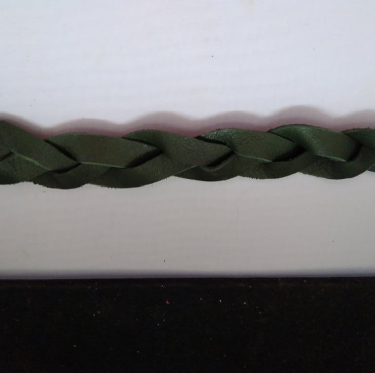 This is a green leather braided/plaited bracelet. It is made from a soft supple leather and finished with a gold press stud. It measures 8.5 inches/21.5cm and is 1 inch/2.5cm wide.