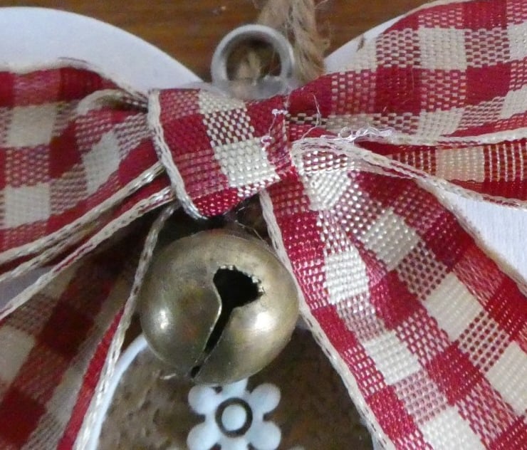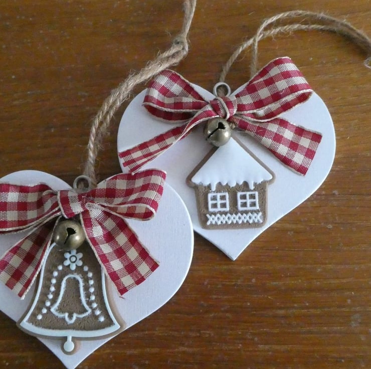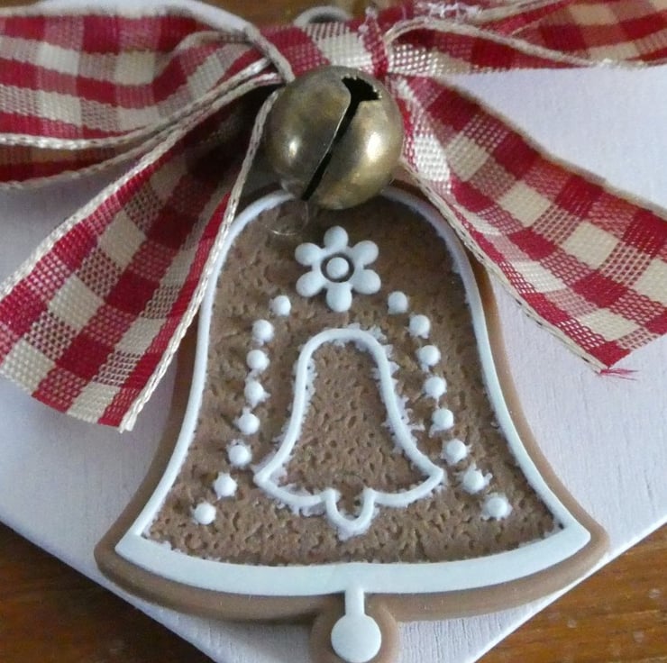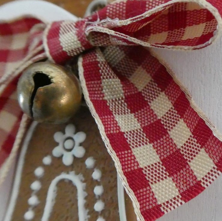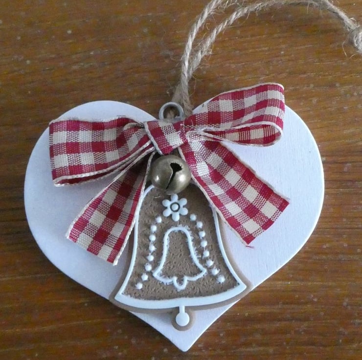 This hanging white wooden heart decoration has a gingerbread style bell embellishment, a gingham red and taupe ribbon bow and an antique brass coloured bell that actually jingles.