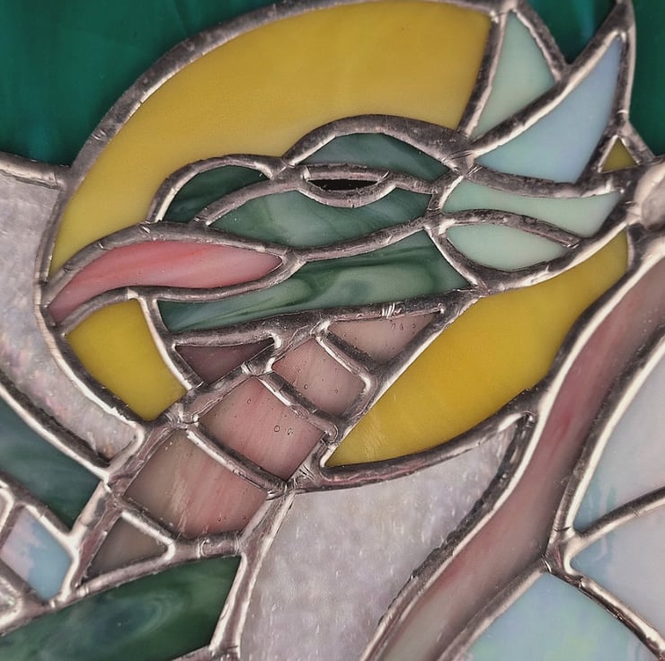 The Dragon is made using shades of turquoise, green, pink, yellow and iridised glass.