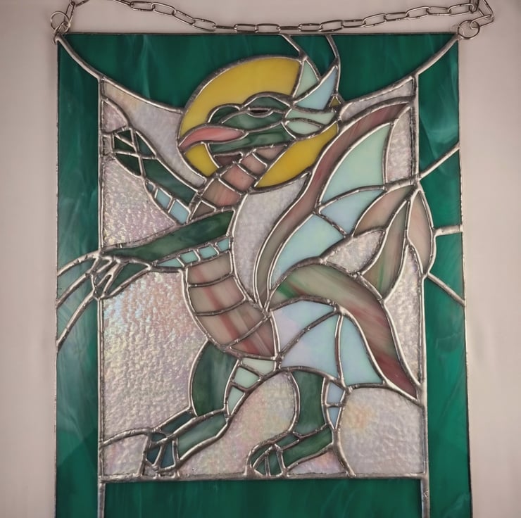 The Dragon is made using copper foil technique where each piece of glass is cut, the edges ground, the copper foil is added, and then the pieces are soldered together and then washed and polished.