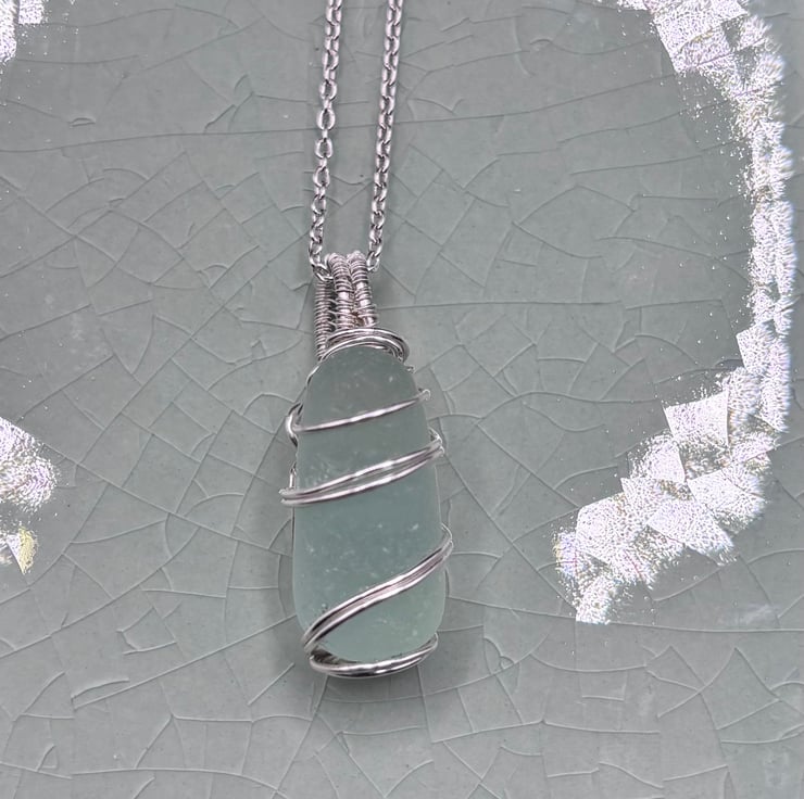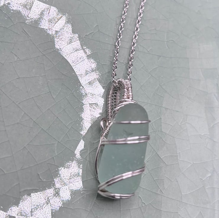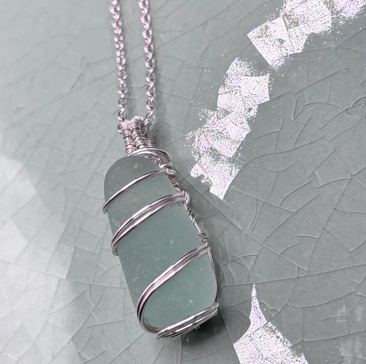 We have created a beautiful sea glass pendant using authentic, naturally tumbled Scottish sea glass that we have collected. The colour of the sea glass is aquamarine. It may have been a part of a glass stopper.