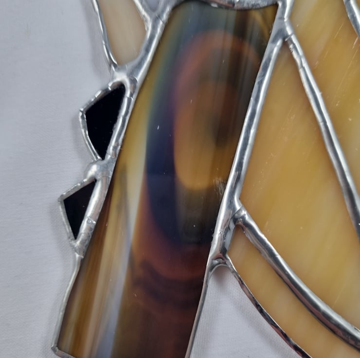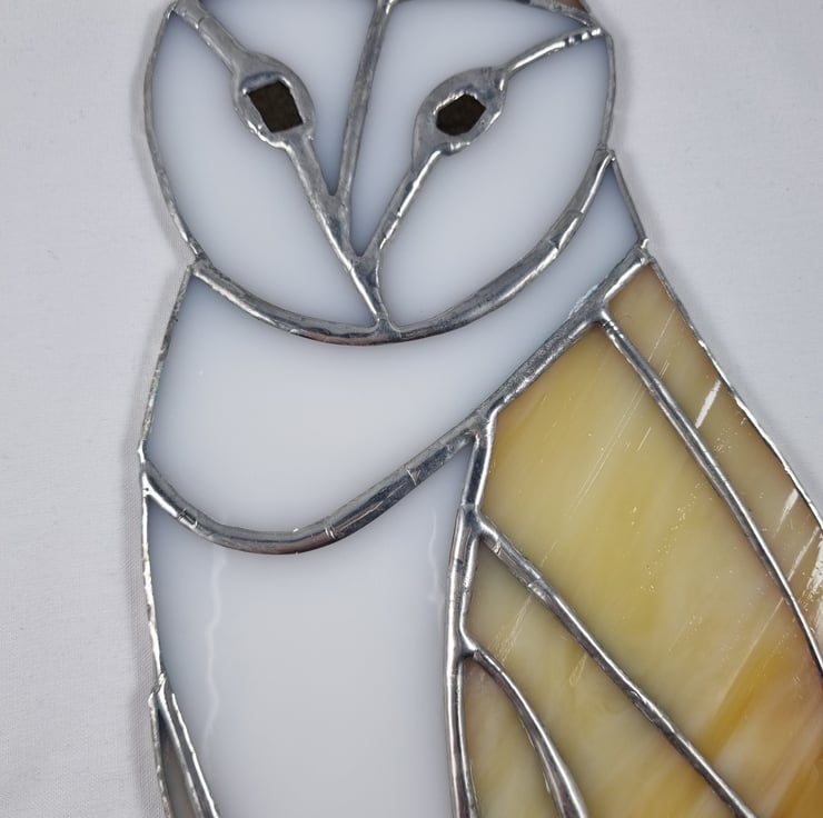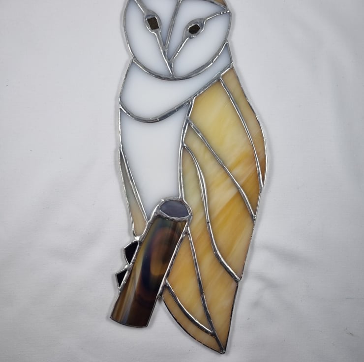 Barn owls do not hoot they screech. A barn owl feathers are super soft - this helps them hunt silently but are not very waterproof and the owl gets soaked if it rains. My barn owl is handmade using the tiffany style technique.