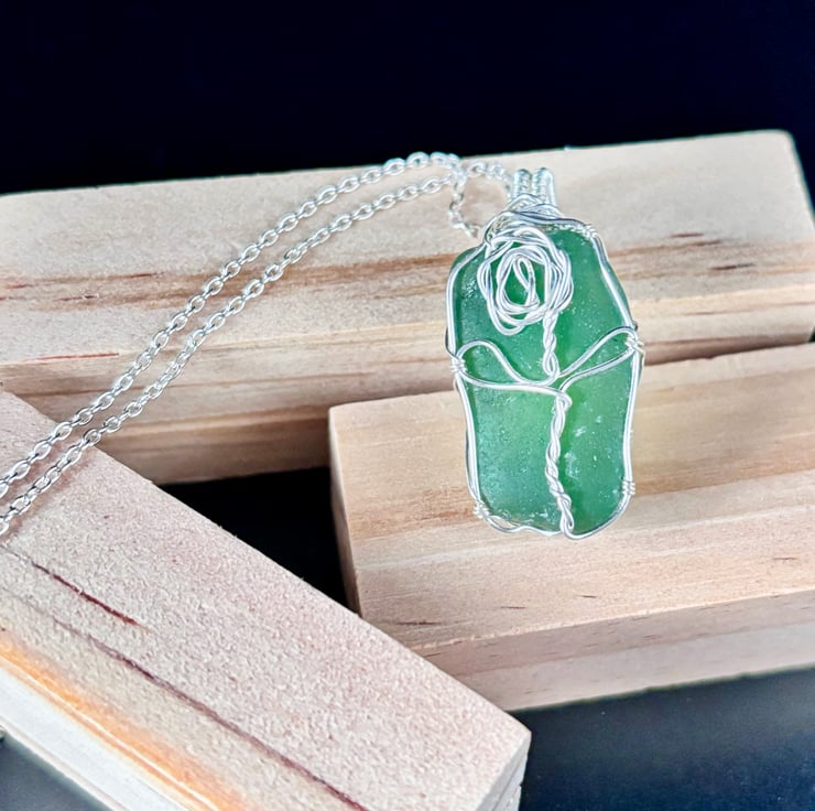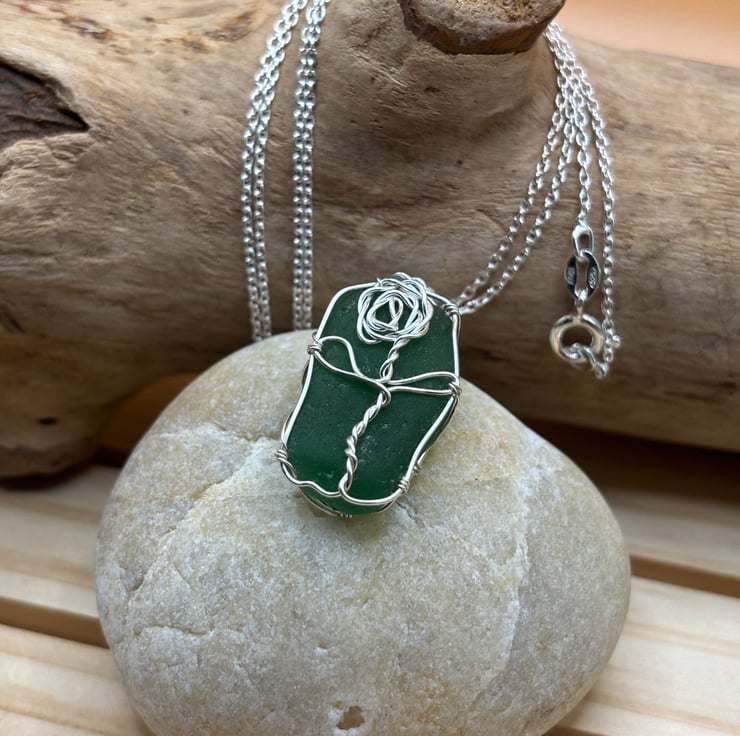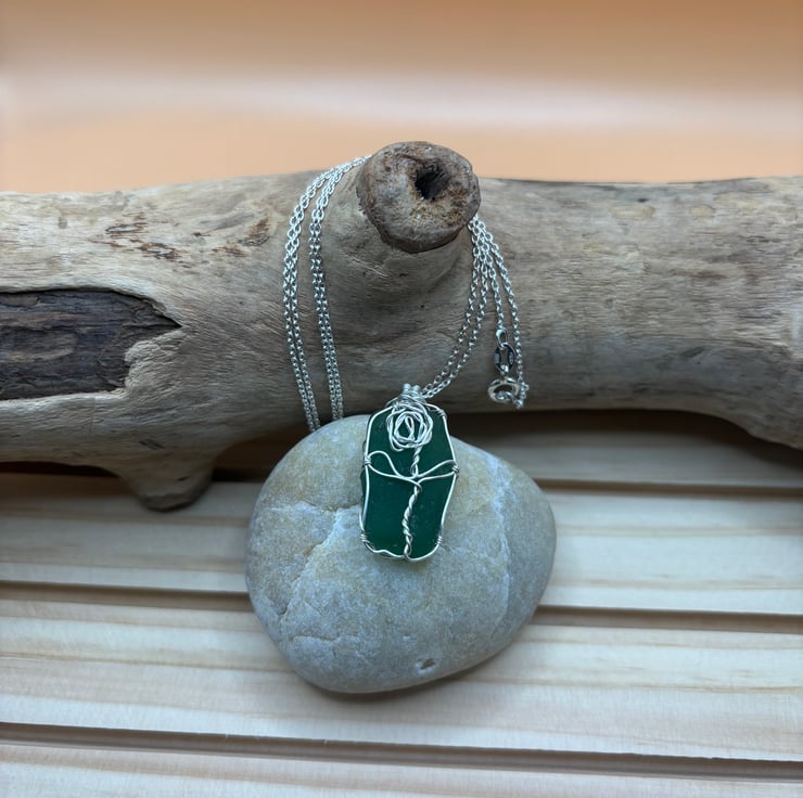 We have created a beautiful sea glass rose design pendant using authentic, naturally tumbled Scottish sea glass that we have collected. The colour of the sea glass is dark green.