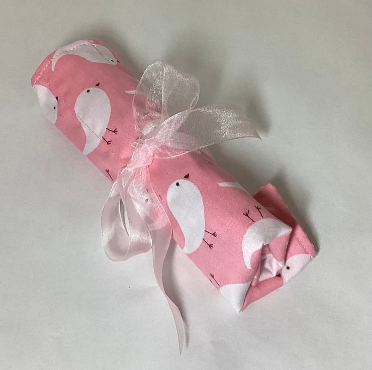 Make up brush storage roll with eight compartments (3cm x 11cm) for brushes. It is made from pink cotton with lines of white birds and lined with pink and white gingham. It is designed to be folded and rolled then secured with the pink organza ribbon.