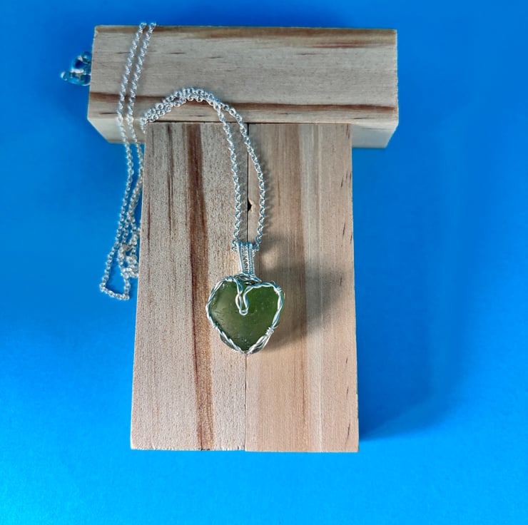We have created a beautiful sea glass heart design pendant using authentic, naturally tumbled Scottish sea glass that we have collected. The colour of the sea glass is green.
