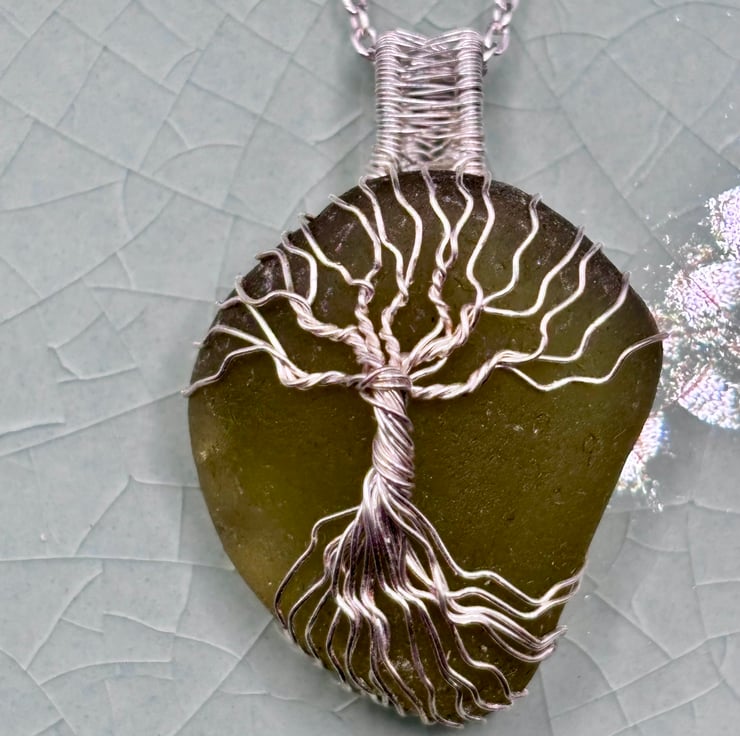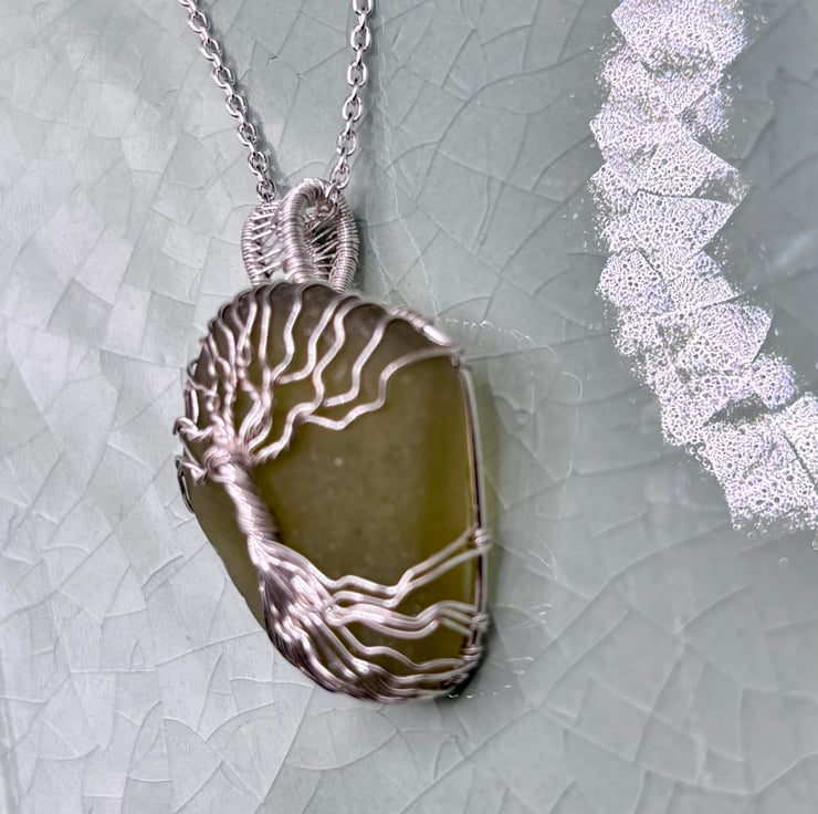 We have created a gorgeous Tree of Life pendant using authentic, naturally tumbled Scottish sea glass that we have collected. The colour of the sea glass is a light olive/lime green.