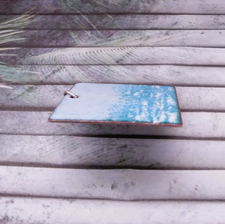 Square enamelled copper pendant with a seascape design in shades of blue and white. The pendant has been kiln-fired and measures approximately 32mm x 32mm. The back has been enamelled to give a lovely dark blue tweed effect. It comes complete with a soldered sterling silver jump ring (6mm) and is supplied with a little organza pouch. It comes complete with a soldered sterling silver jump ring and is supplied with an 18" silver plated snake chain and a little organza pouch.