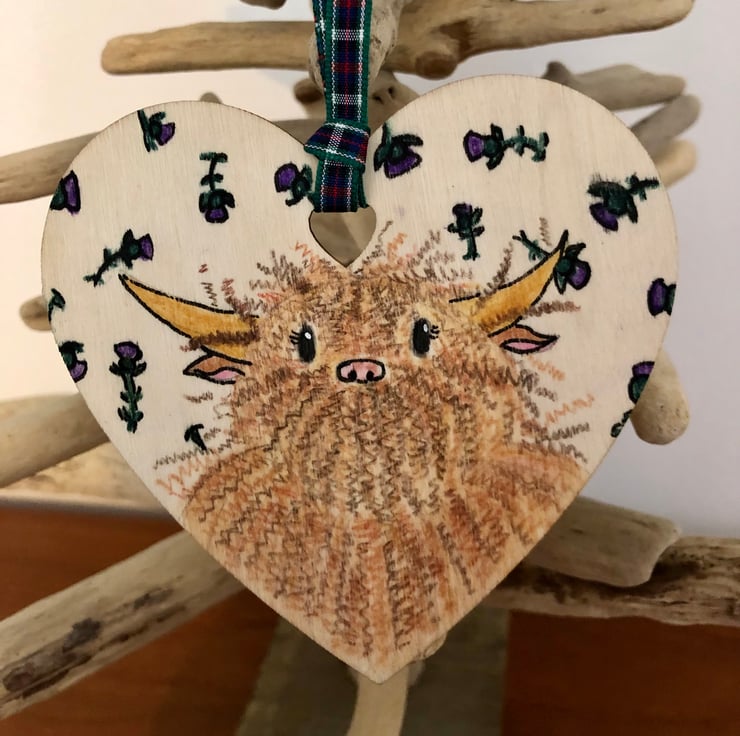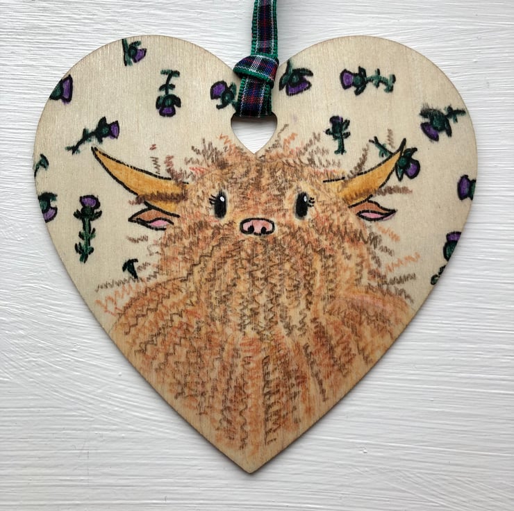 This Highland Cow is a hand drawn onto a wooden heart shape, is a one-off piece, measures approximately 10x10cm and is hung with a tartan ribbon. The item is sprayed with a protective spray to prevent fading and smudging.