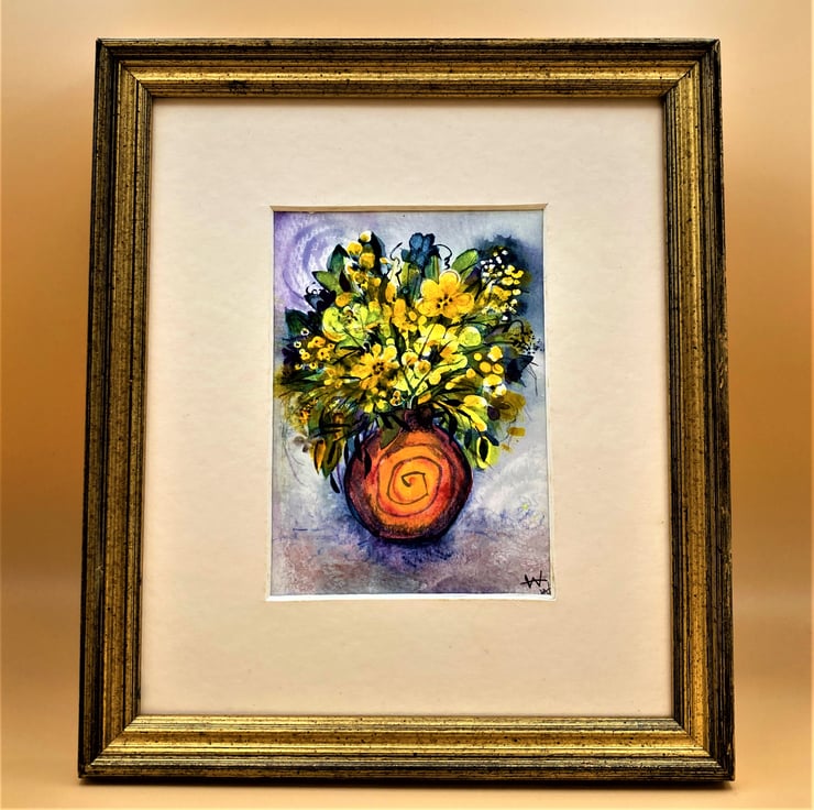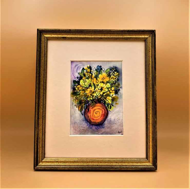This small original framed watercolour painting of flowers in a vase is signed & dated by me. Painted using the best professional artist quality materials the vibrant sumptuous colours of the vase and luscious flowers and foliage contrast well with the restrained misty blue background. All this helps to make this painting a attractive gift for any occasion.