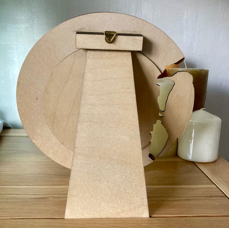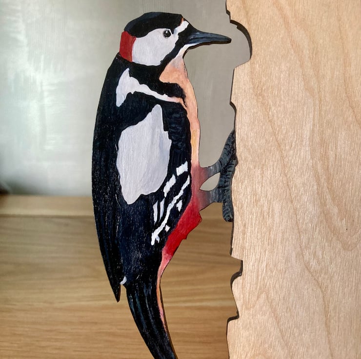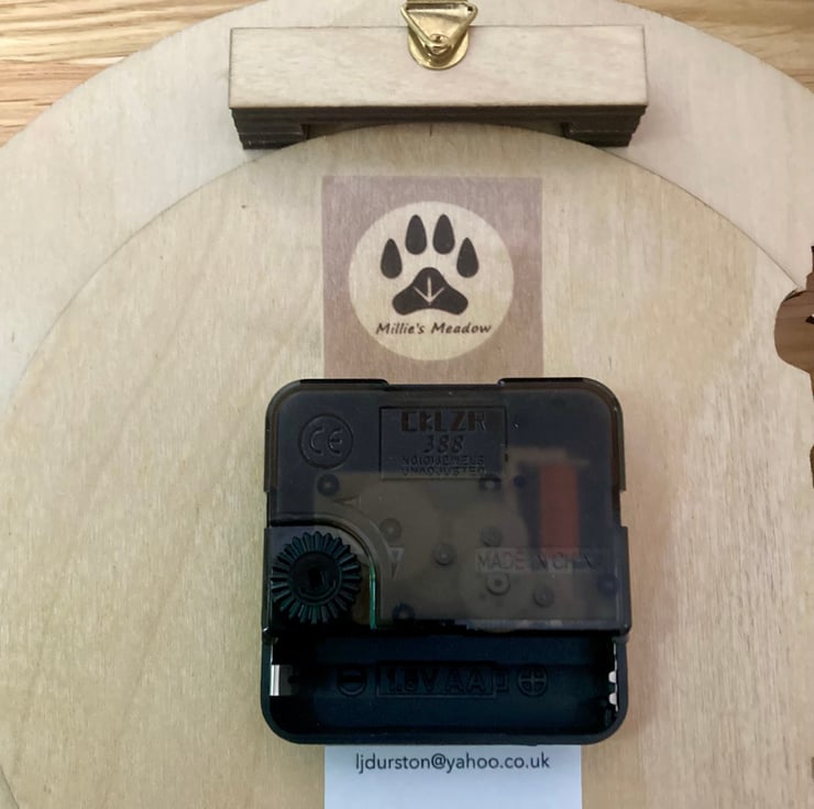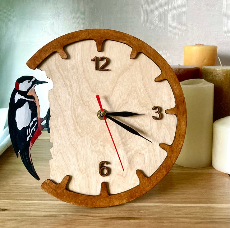 This clock has been cut from plywood and the woodpecker has been hand painted.
