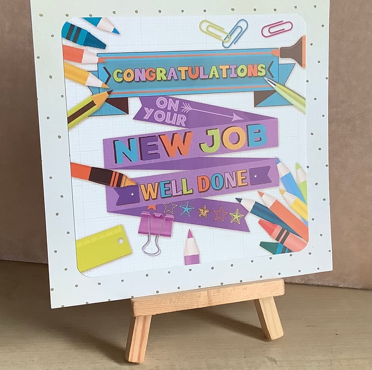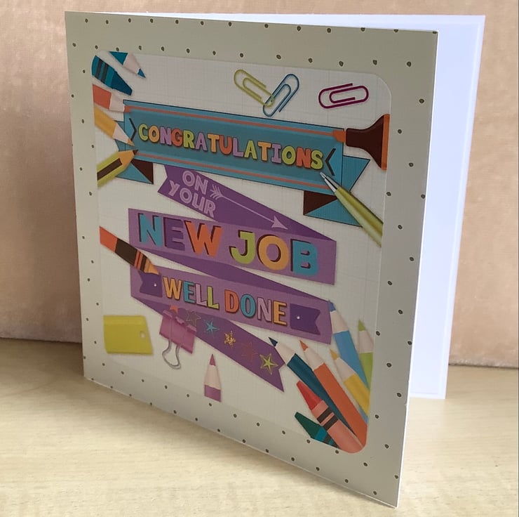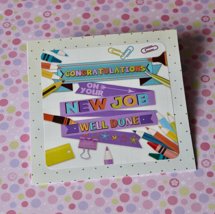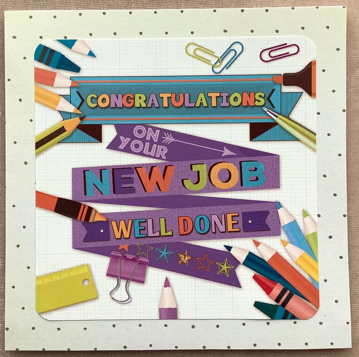 The beige spotty printed card features a variety of brightly coloured stationery equipment, including pens, crayons, a ruler and paperclips. The message reads "Congratulations On Your New Job Well Done".