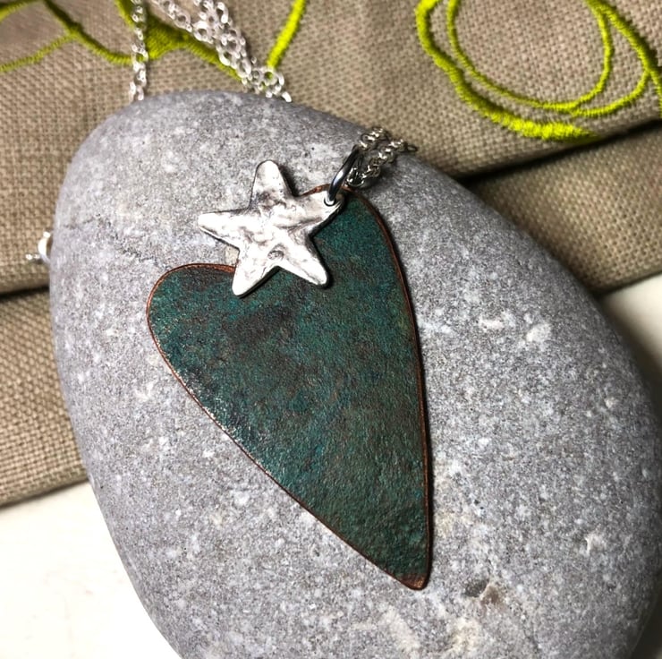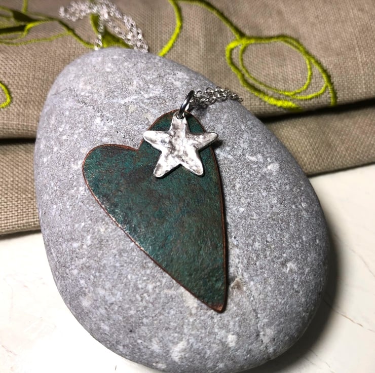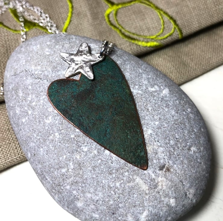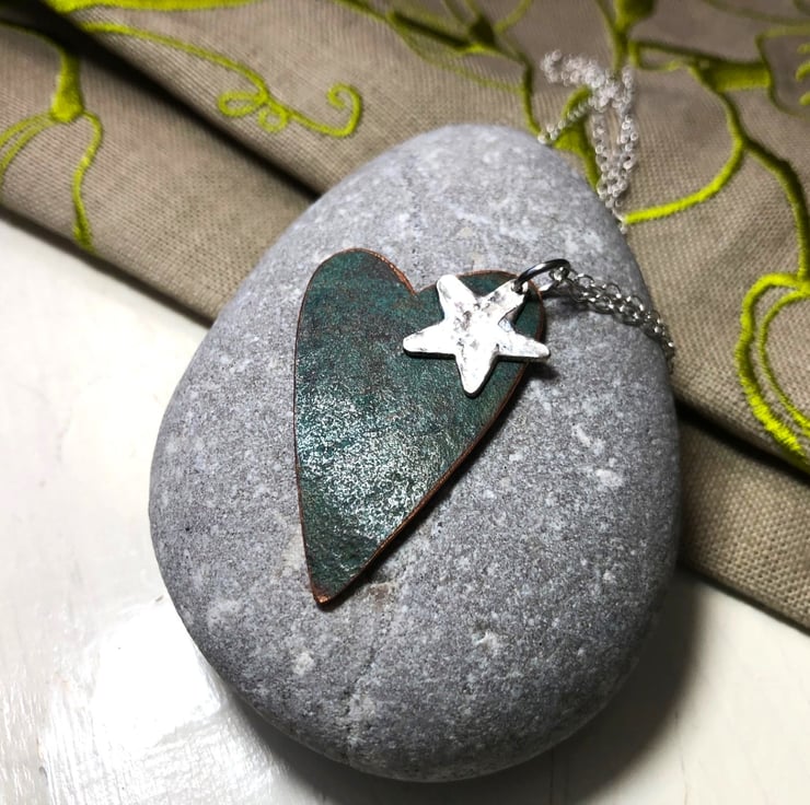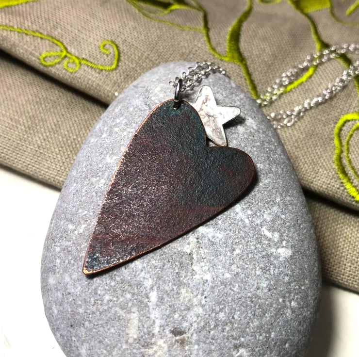 Lovely heart shaped copper pendant with a textured silver star charm. The copper is recycled from a piece found on the beach in Cornwall, it's patination and texturing gained from years in the ocean. The front is greenish and the back has some reddish colours. The silver star charm is following the recycled theme being cast from silver off cuts.