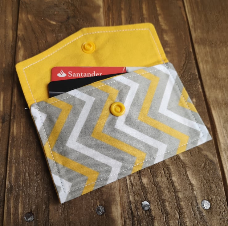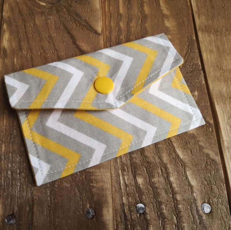Handmade envope style card wallet with snap fastener. Perfect for keeping your cash cards in or even your business cards. Made with soft cotton fabric with a zig-zag design and a yellow cotton fabric lining.