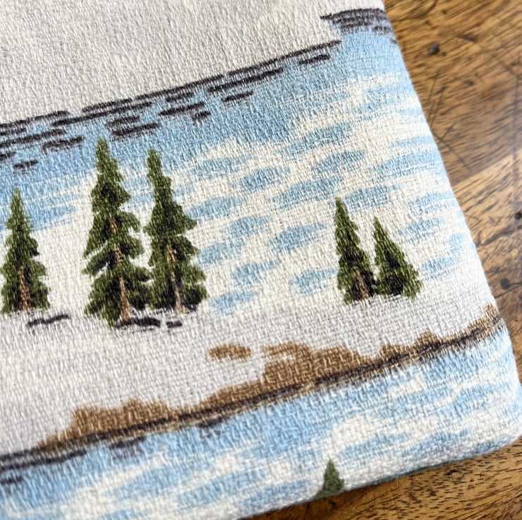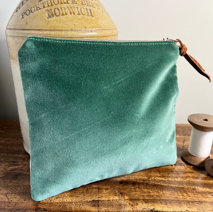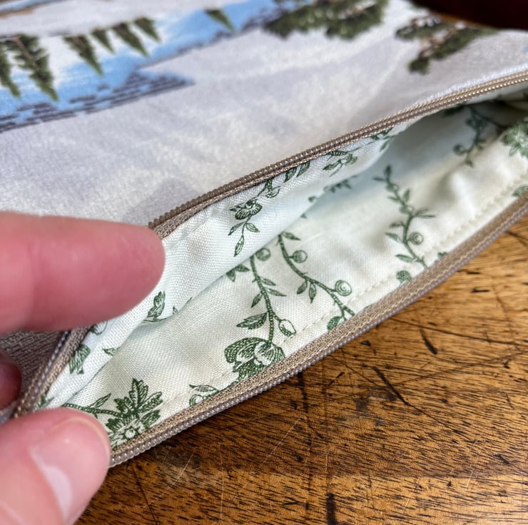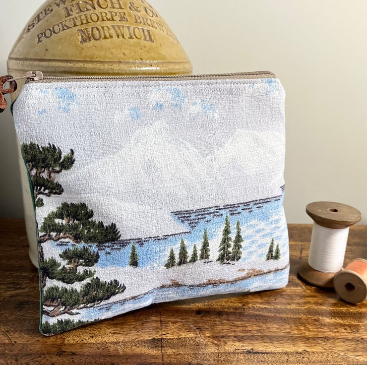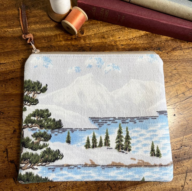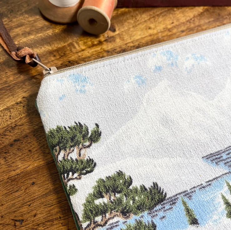 One of a kind zip pouch made from a lovely piece of reclaimed barkcloth from a curtain with a snowy mountain scene. The pouch is backed with soft green velvet and lined with floral Laura Ashley cotton. It has a strip of leather on the zip pull.