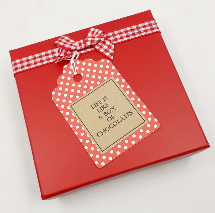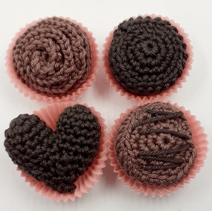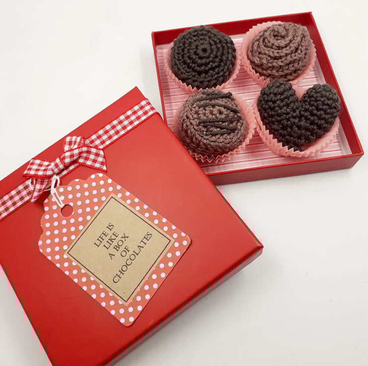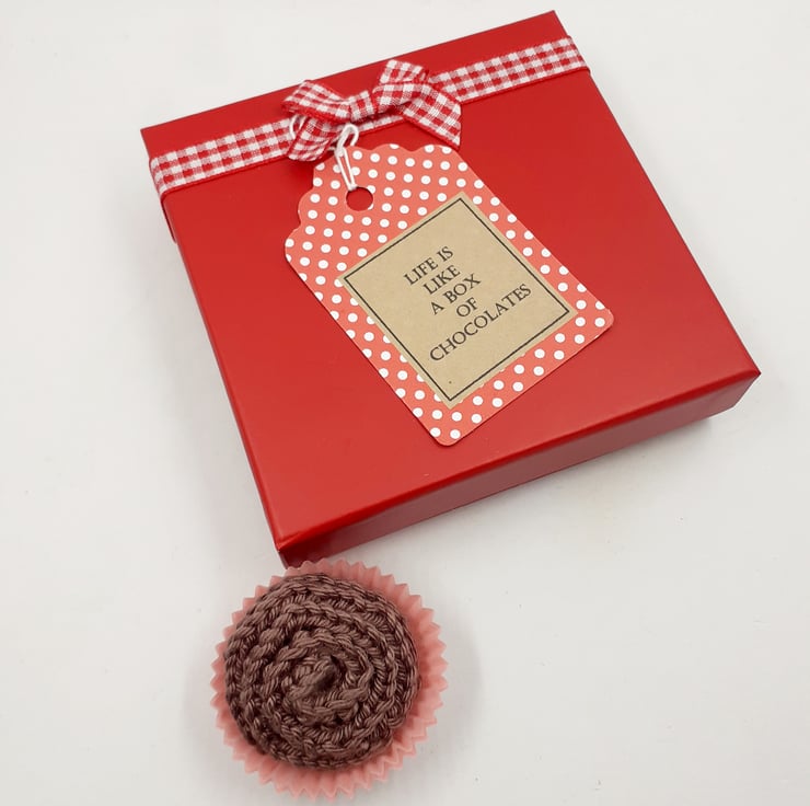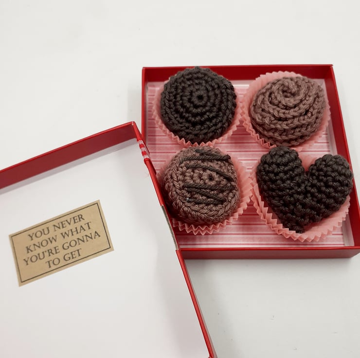 These four delicious-looking chocolates are crocheted in cotton and filled with polyester stuffing. Each is presented in two paper sweet cases inside a repurposed and upcycled ( and therefore slightly imperfect) gift box. The tag attached to the front of the box reads, 'Life is like a box of chocolates' an adapted quotation from the film Forrest Gump and the wording inside the lid completes the quotation with; ' You never know what you're gonna get.'