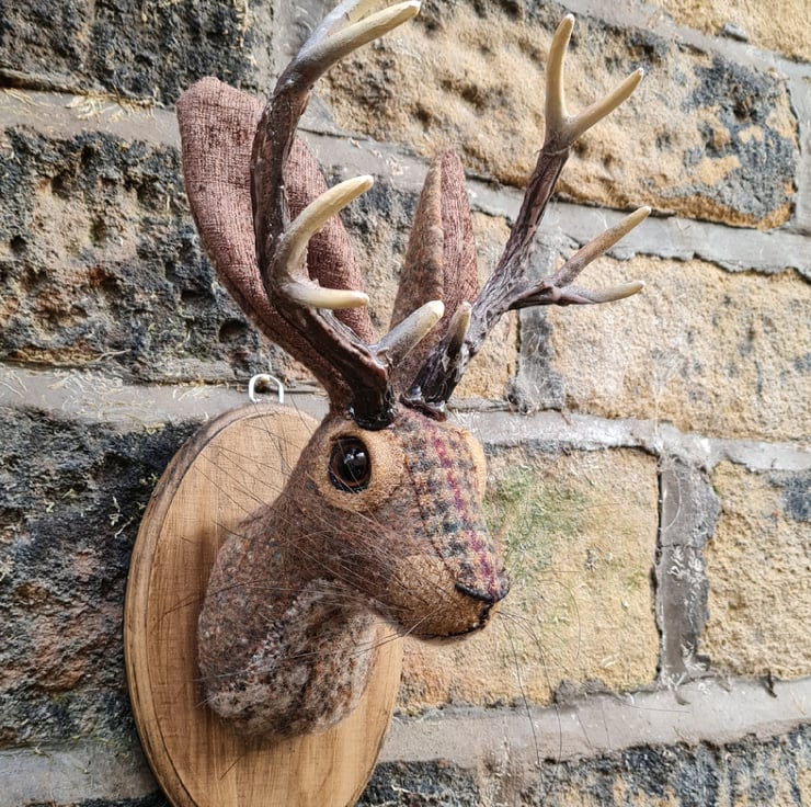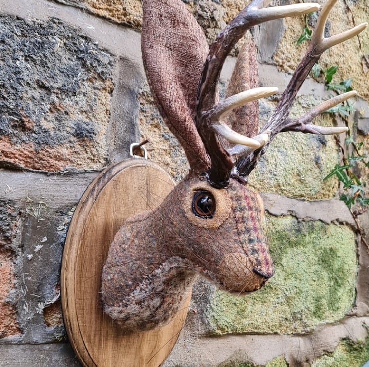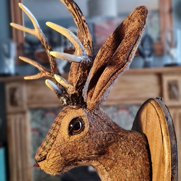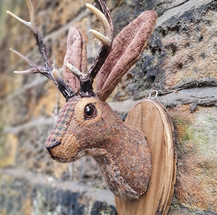 A lifesize textile jackalope head which I have hand stitched with an array of neutral tweed and wool fabric. The antlers are faux and have been hand painted and textured. He is mounted on a wooden oval, which is backed with felt.