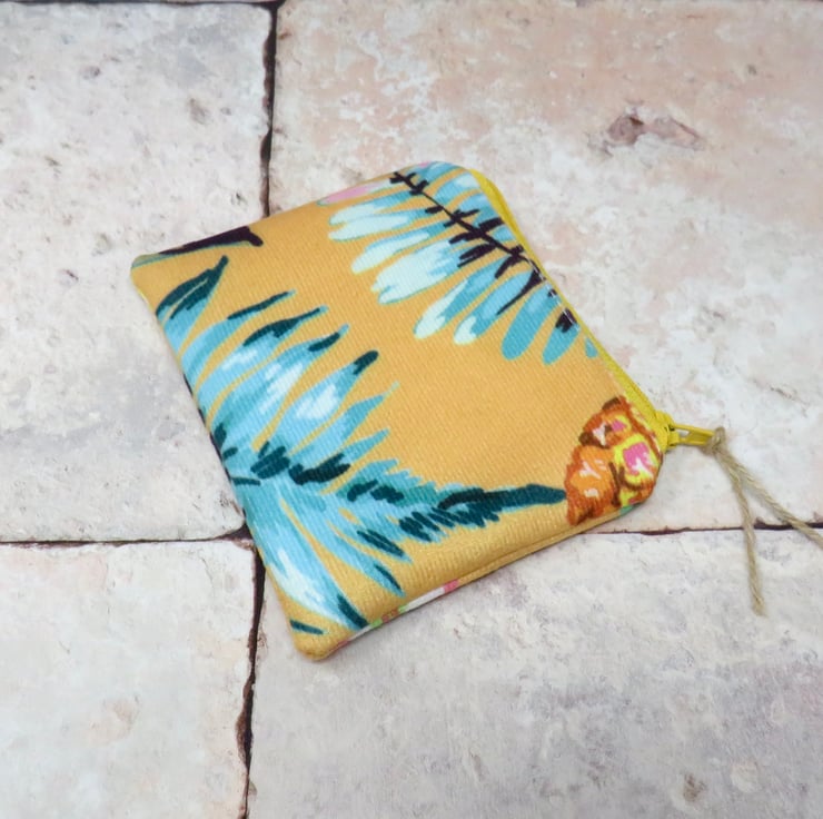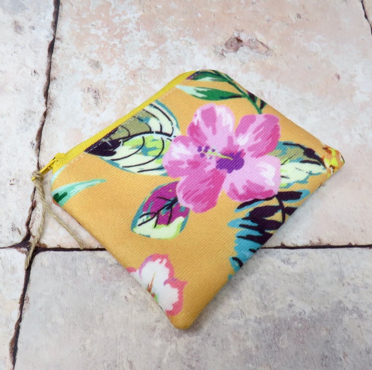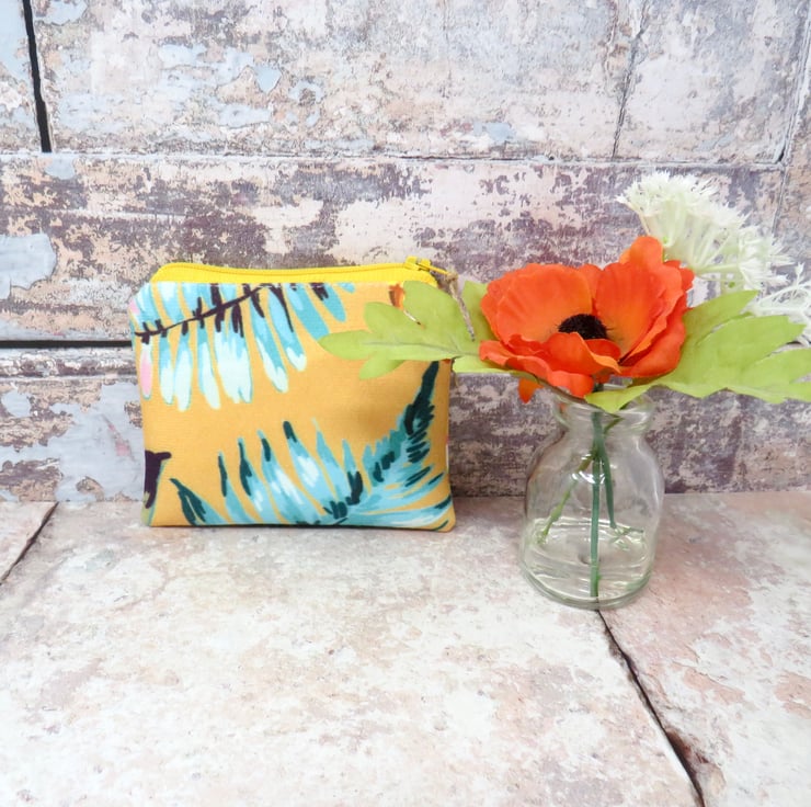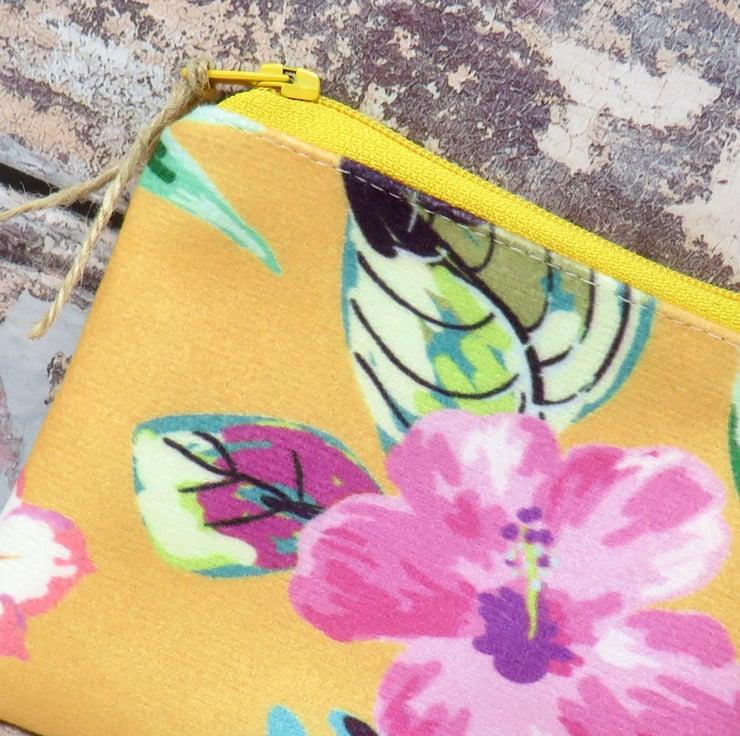 Handmade in a strokeably soft velvet fabric, this coin purse has a floral motif on a bright yellow background. Lined in a grey cotton print, it closes with a yellow zip. Sized at 12 cm x 10 cm it will hold your cash, cards and even your keys! Makes a super thank you gift.