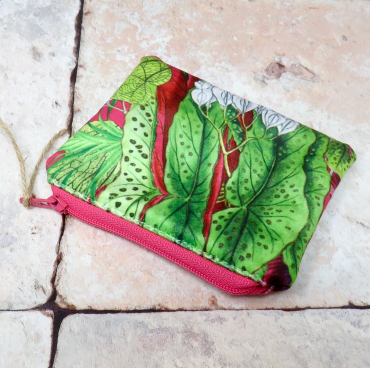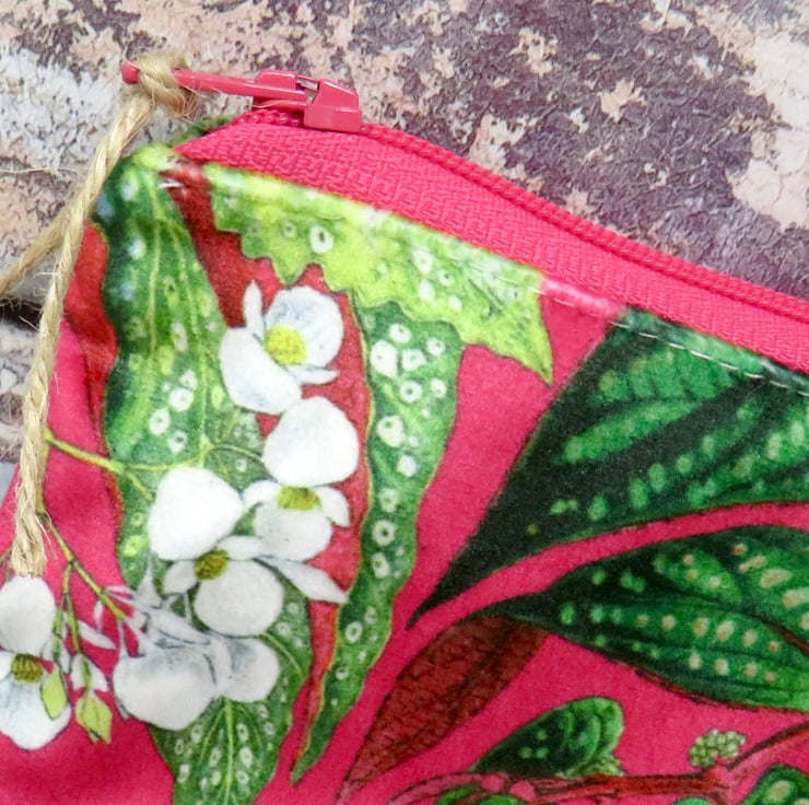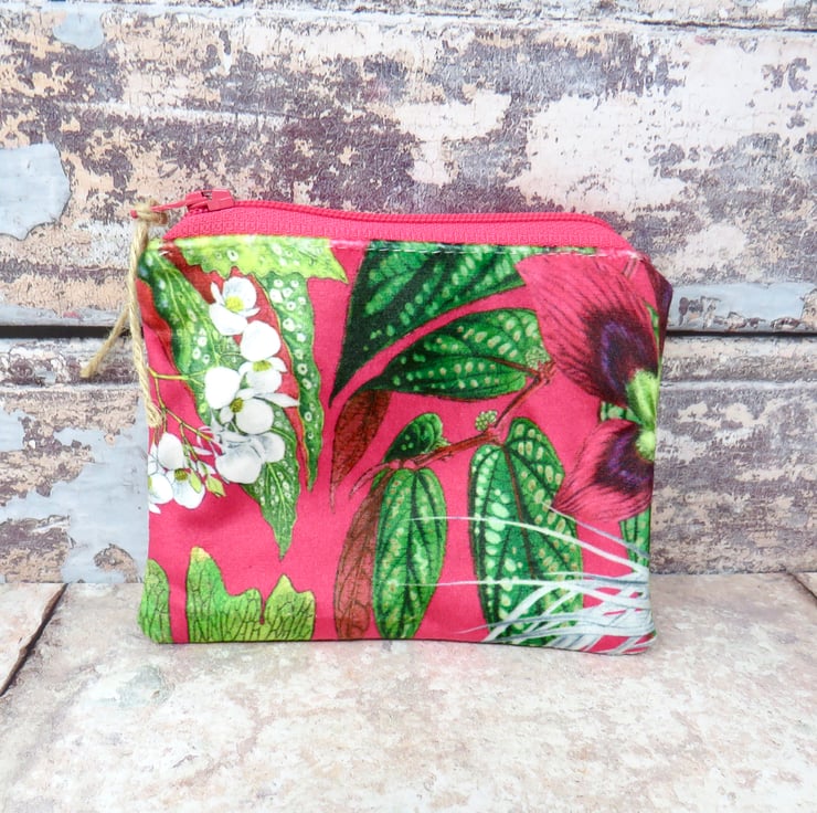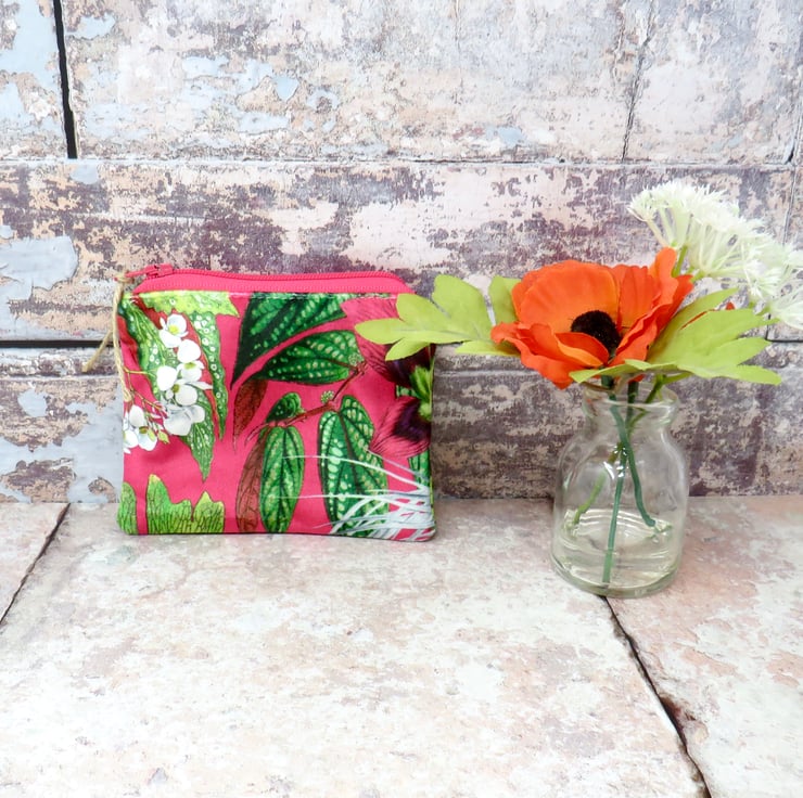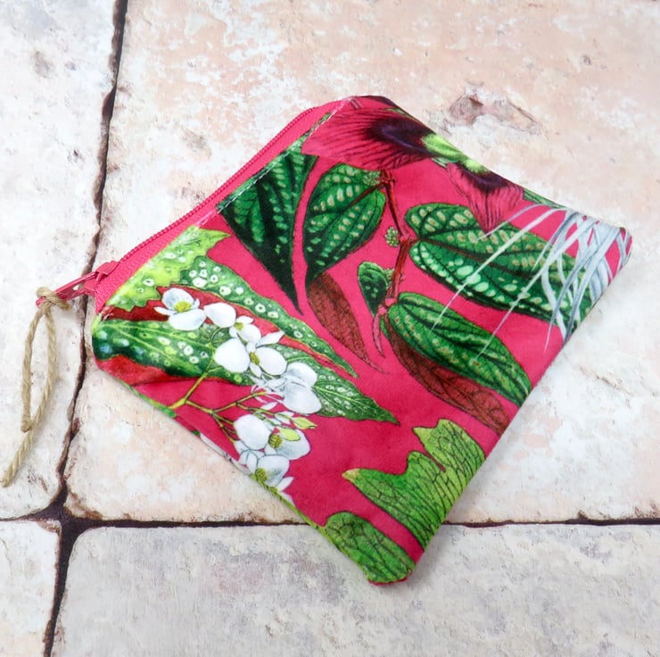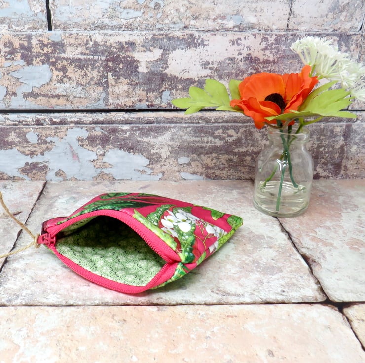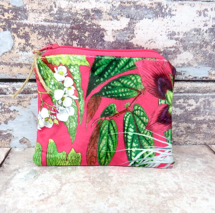 Handmade in a beautifully soft velvet, this coin purse has a cerise background with white flowers and green foliage. Lined in a green ditsy print cotton, it closes with a deep pink zip. The purse measures 12 cm x 10 cm and will hold not only your cash, but your cards and keys too! Makes a lovely gift.