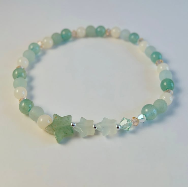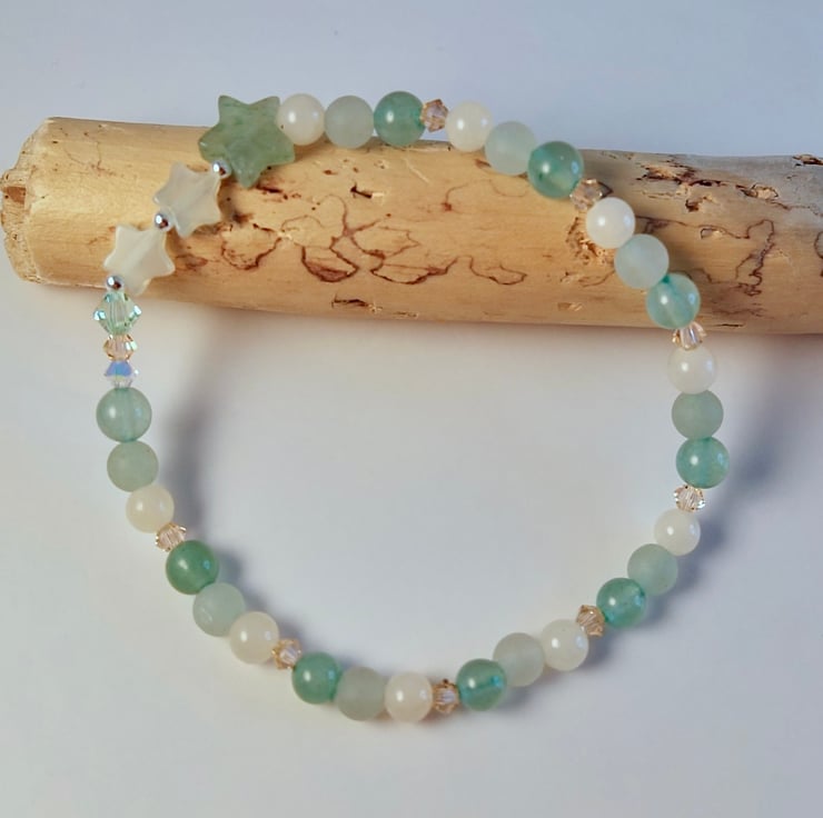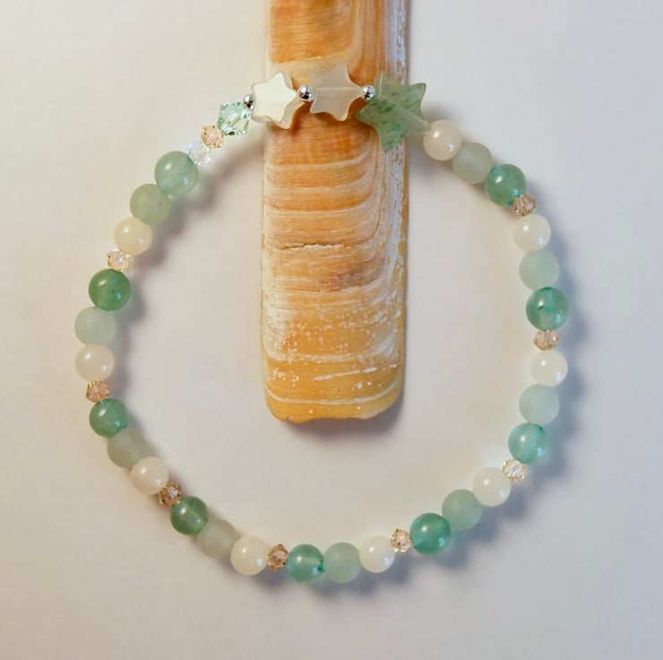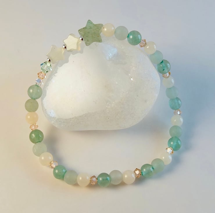 Pretty, dainty bracelet featuring a trio of stars set between 4mm beads of smooth and frosted green Aventurine and pale peach Mashan Jade with a burst of Swarovski crystals forming a sparkly tail behind the stars.