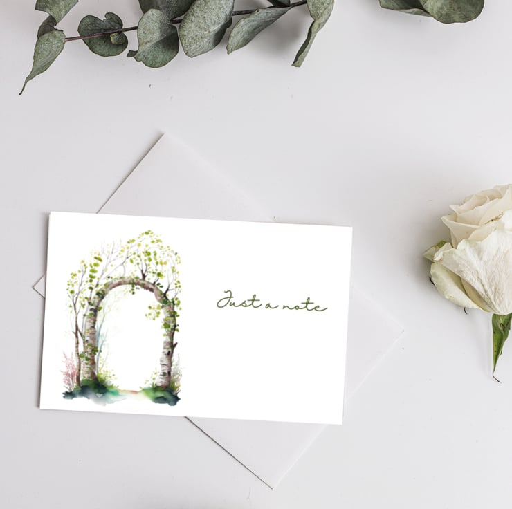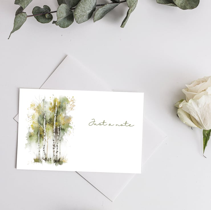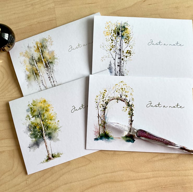 Simple watercolour prints of graceful Birch trees feature on our limited edition A6 pack of eight 10.5 x 14.8 cm (approx) folded note cards.