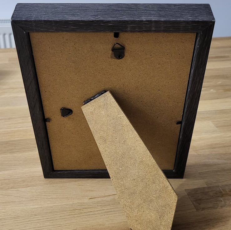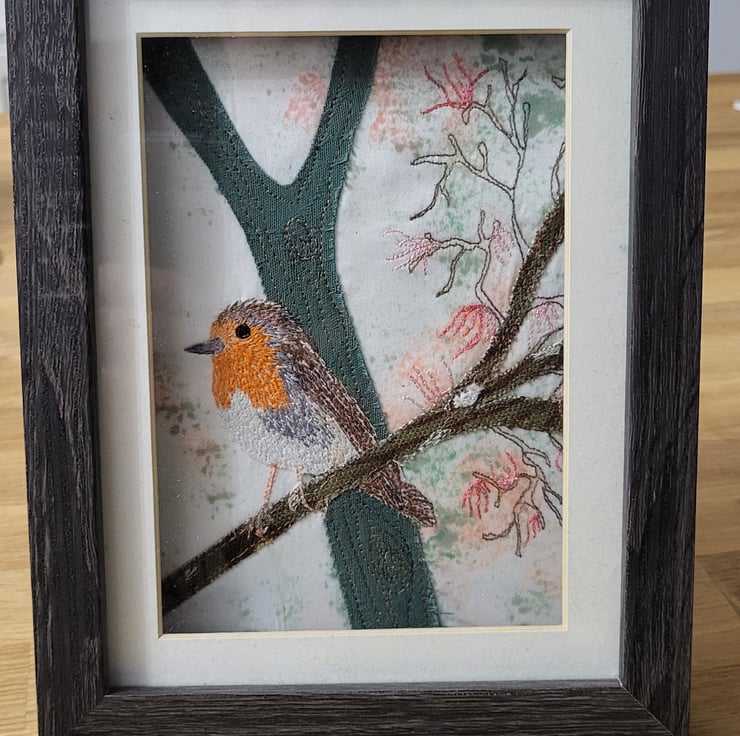 Framed, machine embroidered robin on appliqued branches set on a fabric painted background.Frame can stand on surface, dimension of frame 178mm x 226mm x 30mm deep