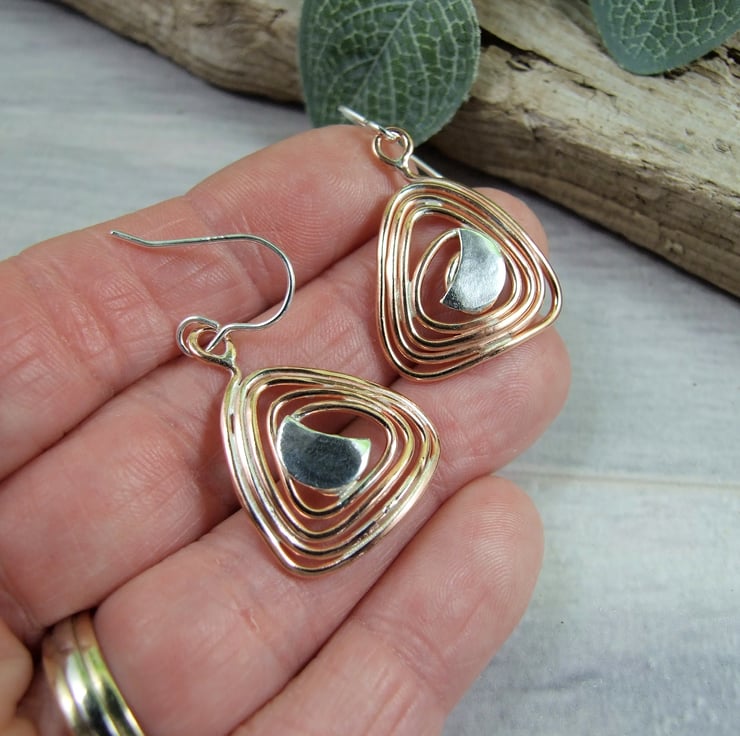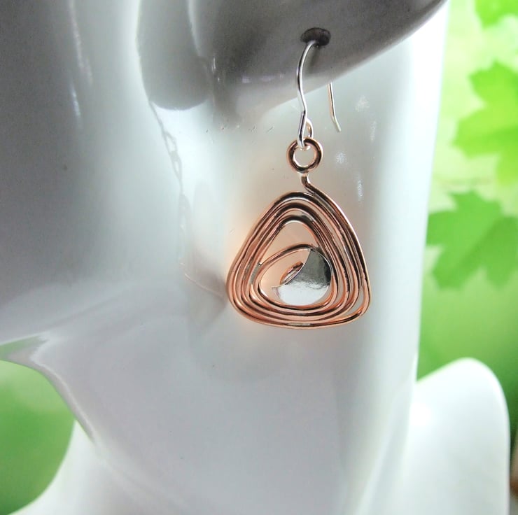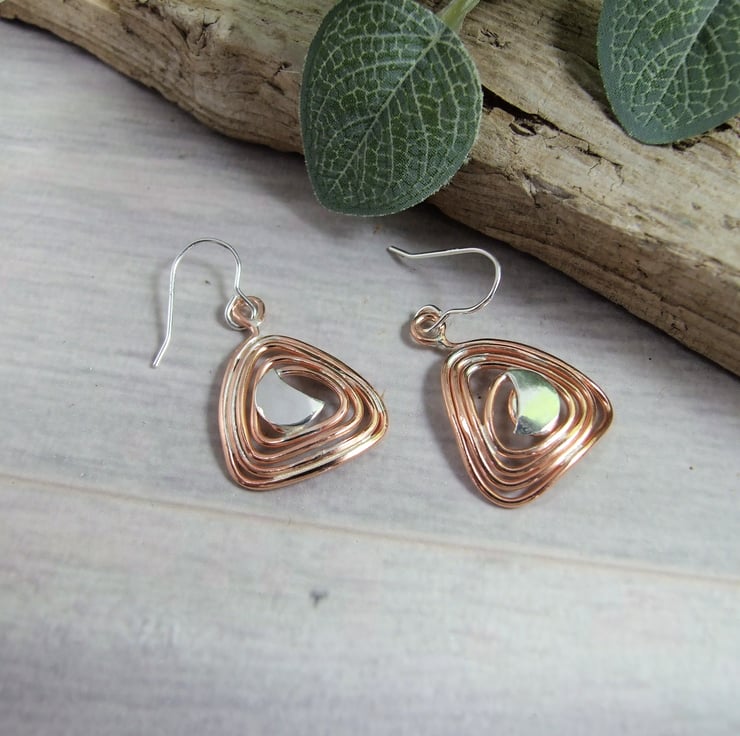 I have created the triangle shape by hand, coiling the copper wire and soldering to secure. At the centre I have soldered a sterling silver moon and fitted to sterling silver ear wires.