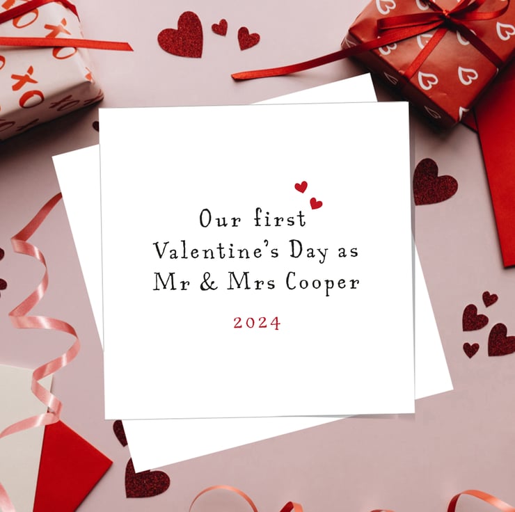 Perfect card to celebrate your first Valentine's Day together as a married couple. Simple design with shimmer red hearts. Personalised on front of the card, add your titles and surname in personalisation box when ordering.