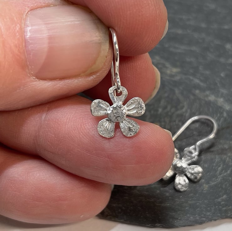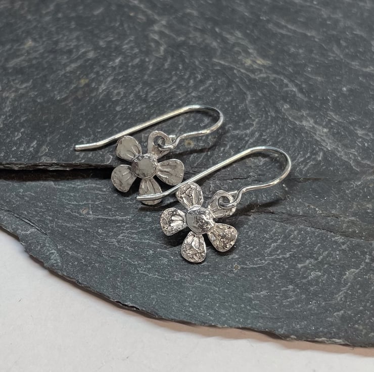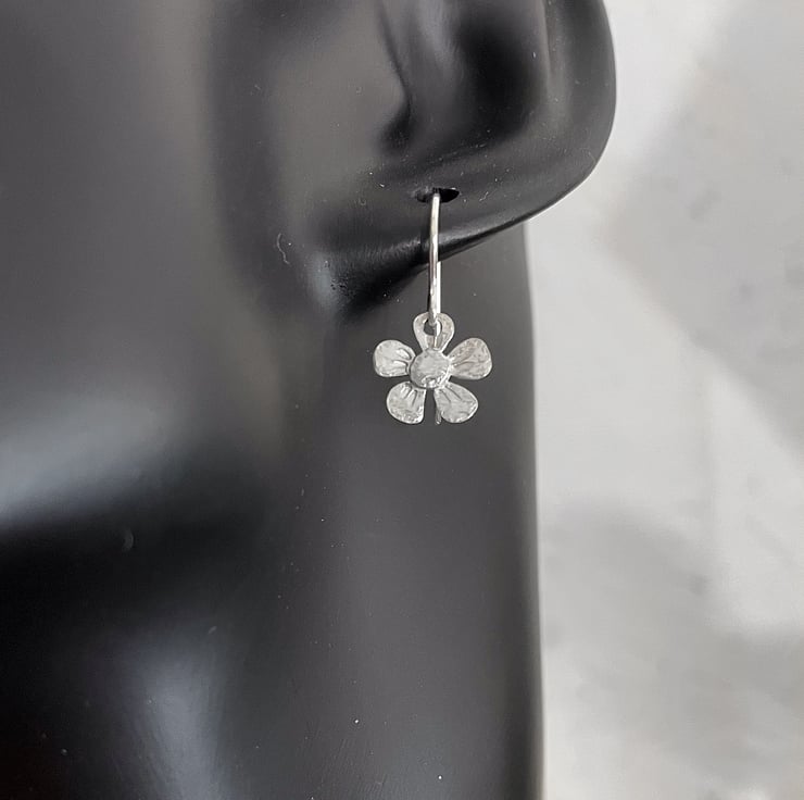 Small silver flower drop earrings.