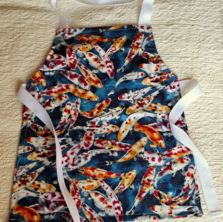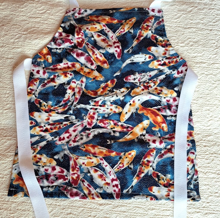 Made from a gorgeous cotton remnant, this midnight blue apron is printed with incredibly realistic swimming goldfish. The water is highlighted with splashes and spots of sparkling gold print. The apron measures 16.5" (42cm.) from neck to hem and 15" (38cm.) at the widest point and will fit a child from approximately two to six years. The straps are white acrylic. The apron can be machine washed on a cool setting and can be ironed.