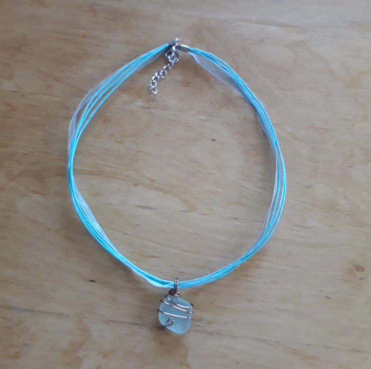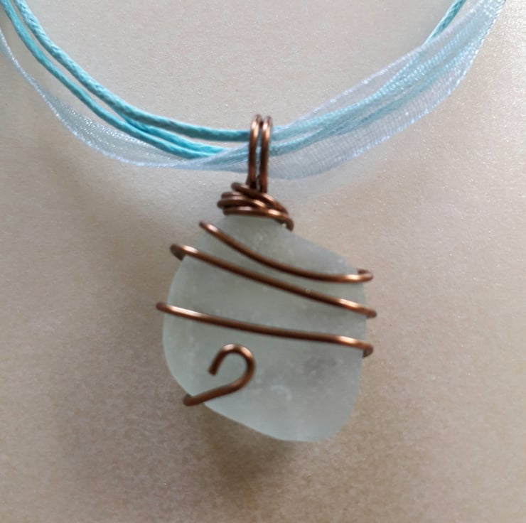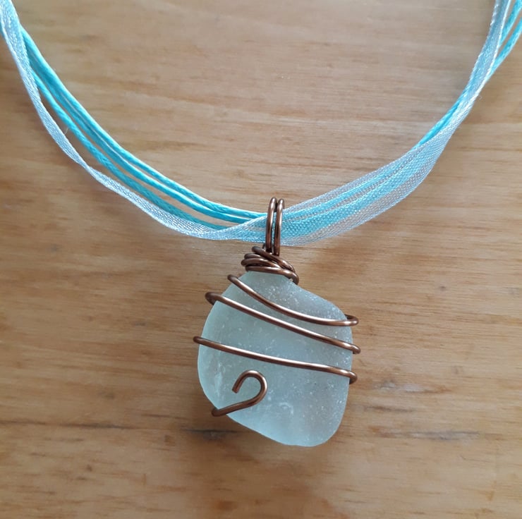 Genuine Seaham Sea Glass Necklace. A pretty pendant, bronze copper wire wrapped around hand picked aqua Beach Glass. The necklace is a perfect summer accessory! It hangs on a blue/aqua ribbon & waxed cotton cord 18 inches, with 2 inch extension.