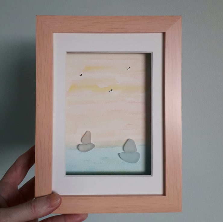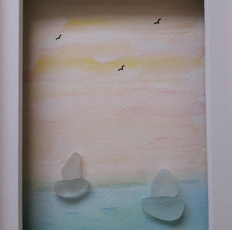 Original Watercolour Beach Scene with Sea Glass Boats - a cute little picture of sunrise at sea - hand painted and ready to post. This picture is mounted and framed in a contemporary light wood effect frame 15 x 20 cm (6 x 8 inches) with ivory mount, ready to post today.