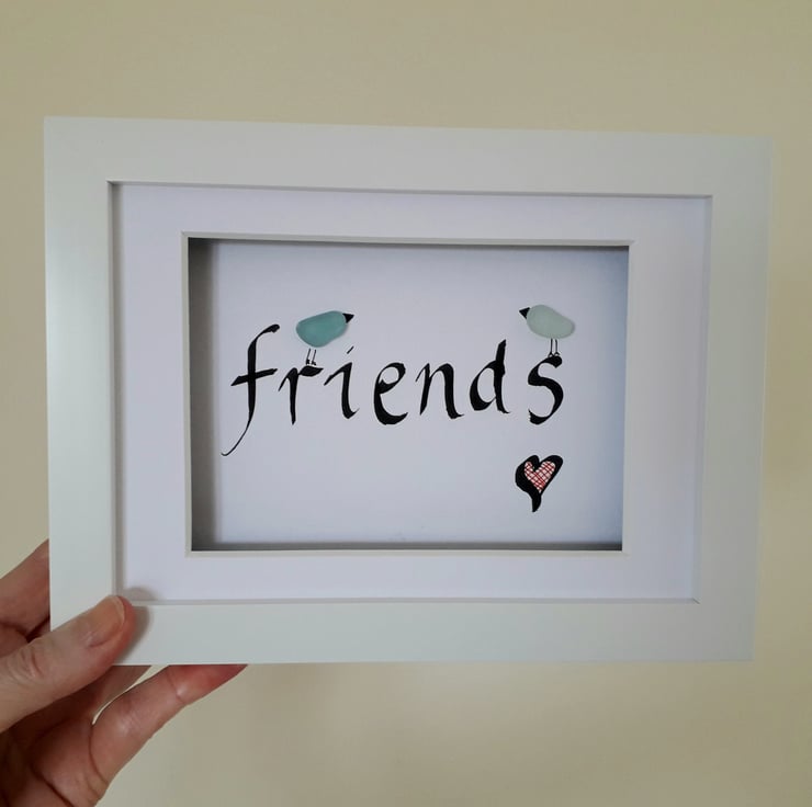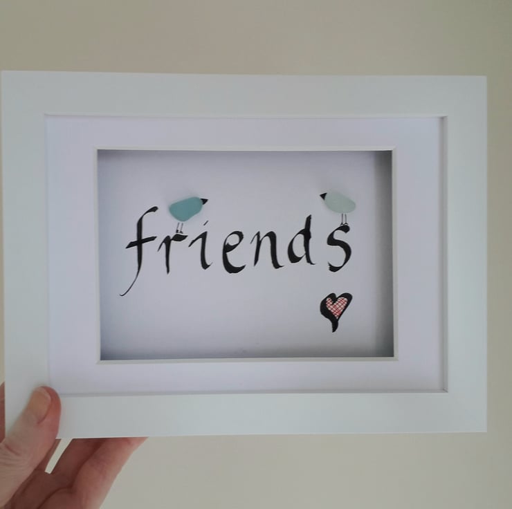 Sea Glass Art for your friend - Unique gift of genuine sea glass and calligraphy - 'Friends' a gorgeously cute gift to celebrate your friendship! The sea glass is hand picked by me from Seaham, England with the letter and heart hand-drawn. What you see is what you will receive. If you would like a custom made picture with 2, 3 or 4 birds on white cardstock simply drop me a line and I can make to order.