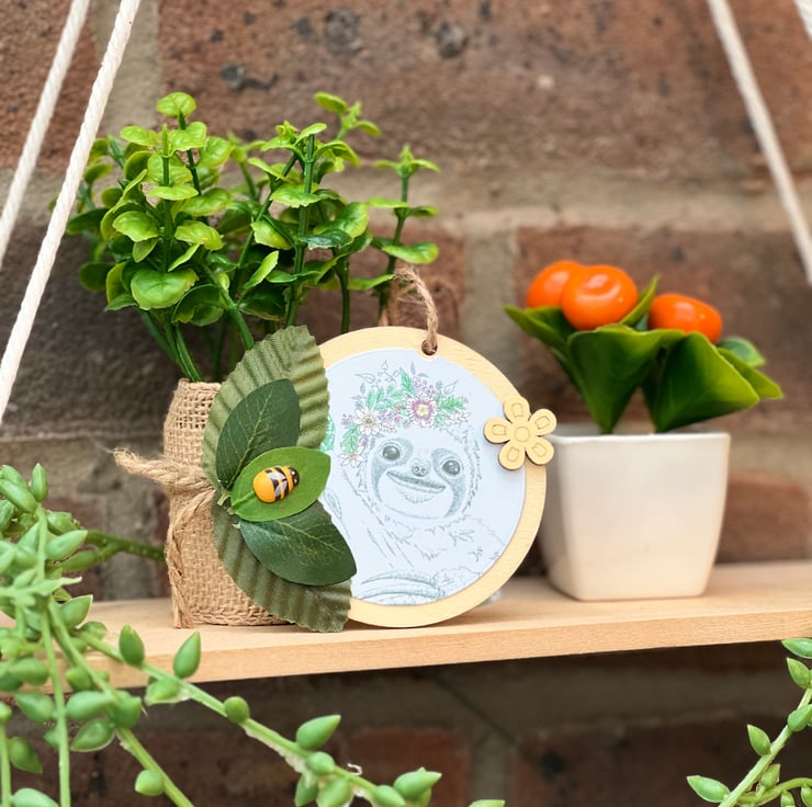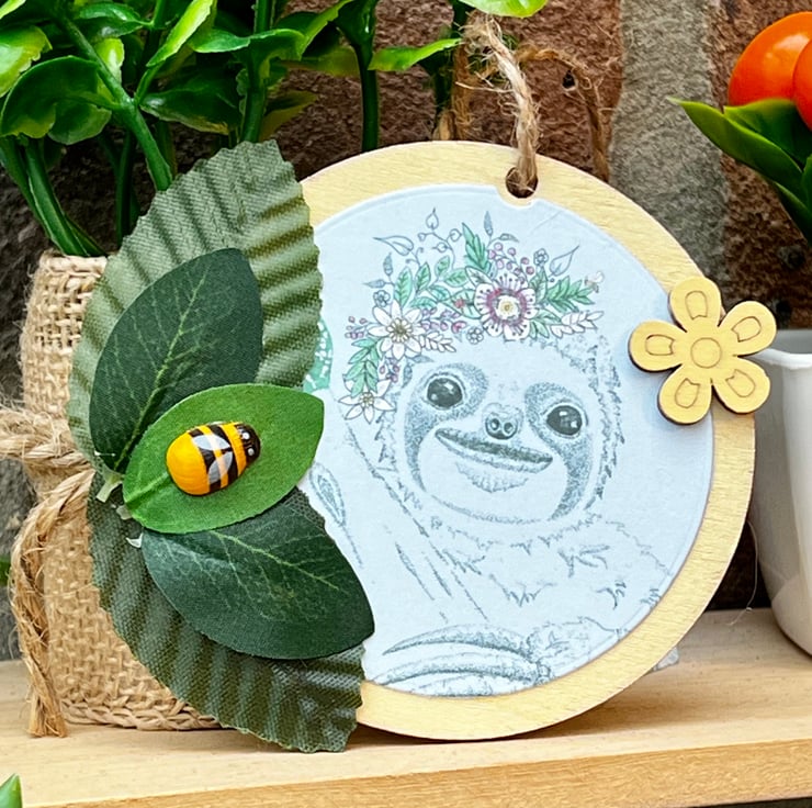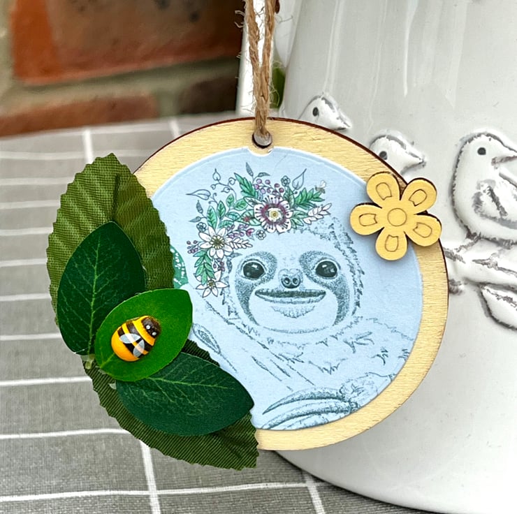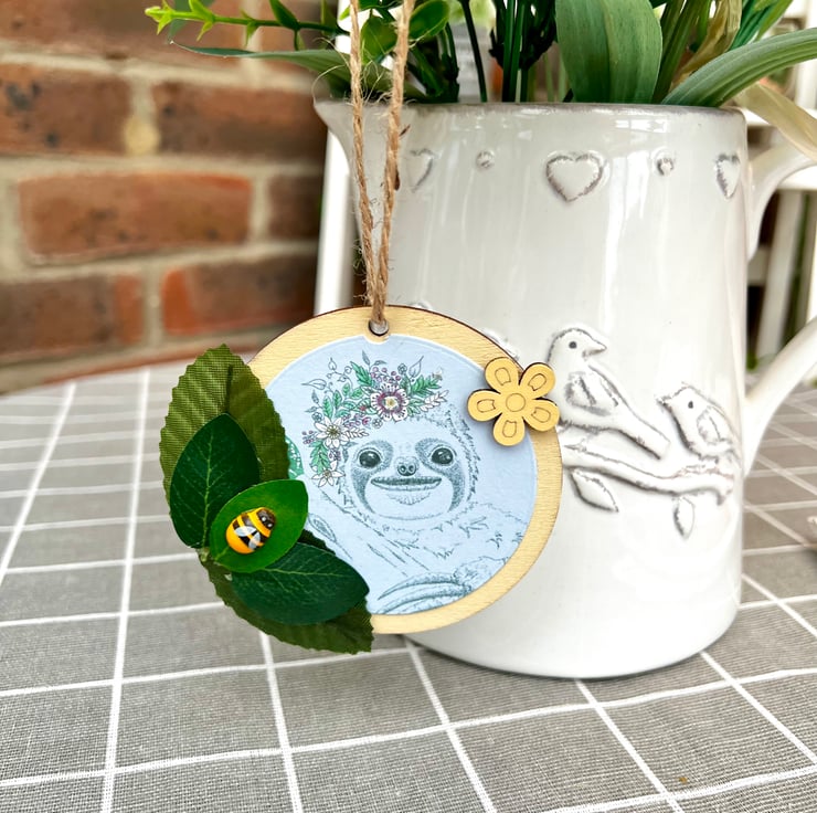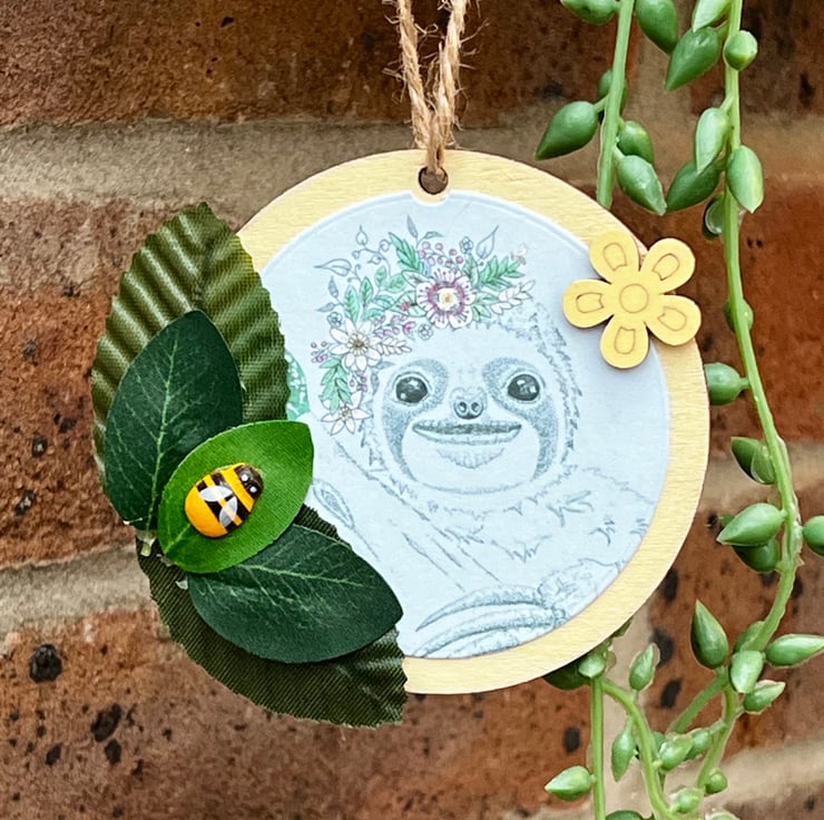 ‘Wooden hanging decoration’ - Artists Illustration of a ‘Smiling Sloth with bee’. This image is a colour print of my pen illustration featuring a cute happy sloth. It has been printed on 120gsm ultra-bright silky paper and placed on a 8x8cm approximate wooden circle. It is then finished with decorative leaves & small wooden crafts including a bee. This item is handmade & hand painted with acrylic paints.