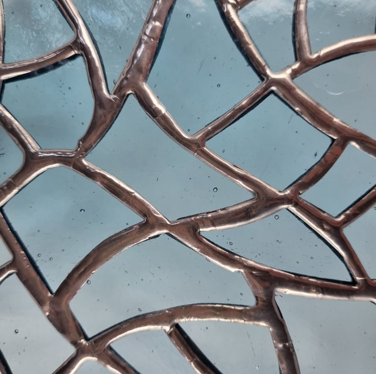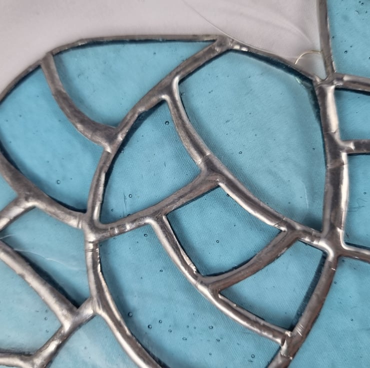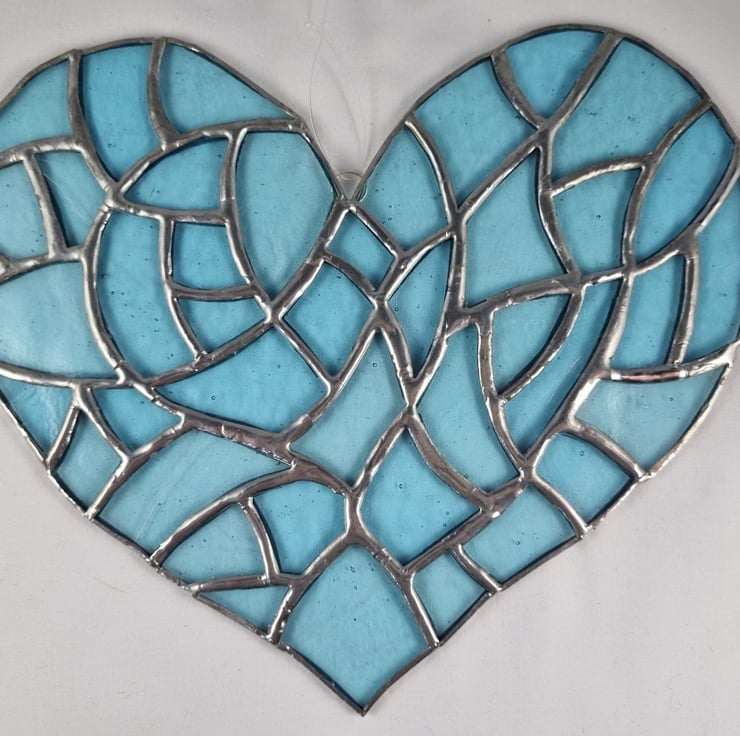 I have made the heart using blue translucent glass. There is a ring and invisible thread for hanging.