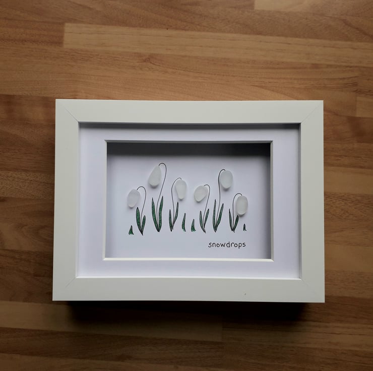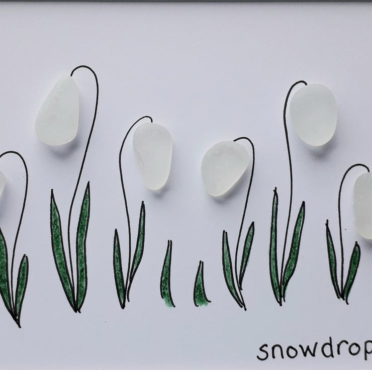 Snowdrops! Who doesn't love the first sign of spring. This pretty picture is made from Seaham Sea Glass which I hand pick from the beach, watercolour pencil and pen. The glass is gently washed and left to dry and it is transformed into original gifts. The artwork is mounted on white card in a high quality contemporary frame with a high shine to the glass (15 x 20 cm) 8 x 6 inches. Choice of frame colour available.