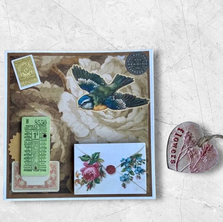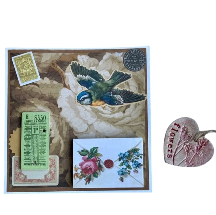 The card has been layered with coordinating paper in shades of browns and beige and features flea market inspired style die cut tokens. A little floral envelope has been added in 3D which houses a ceramic heart keepsake featuring the word ‘Flower’.