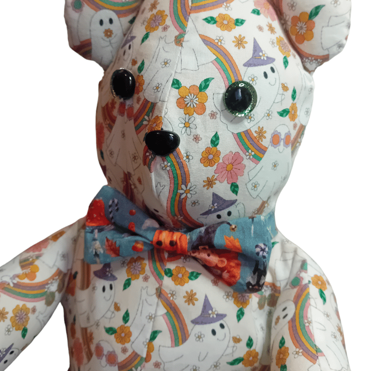A handmade bear with safety eyes and nose, approx 14.5 inches tall Boo Bear comes with his own bow tie. Non machine washable due to the backing that gives their eyes their sparkle.
