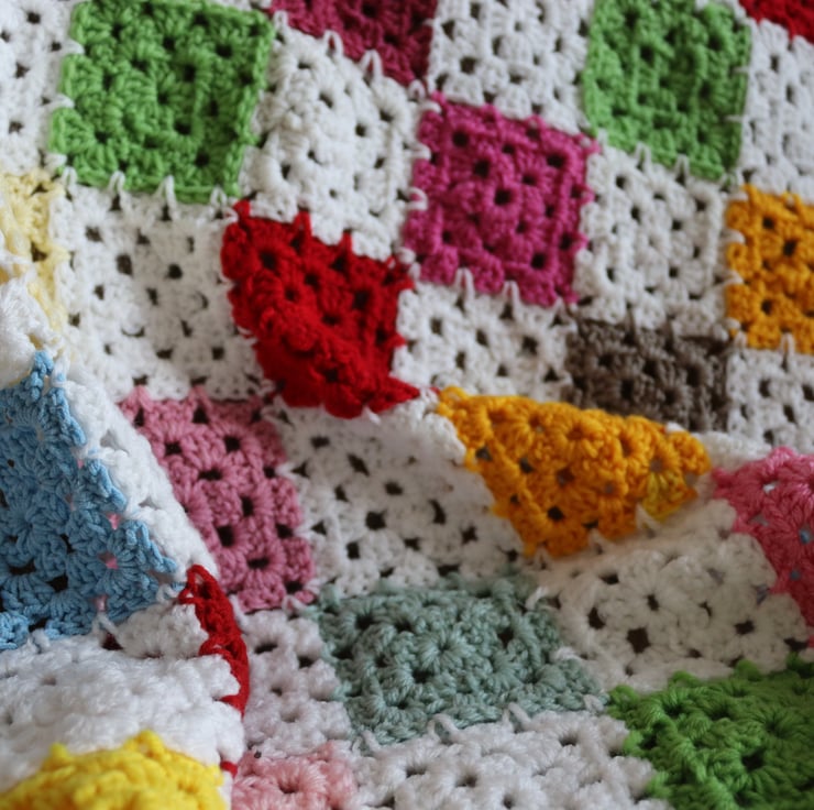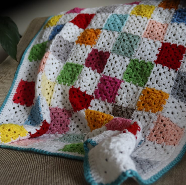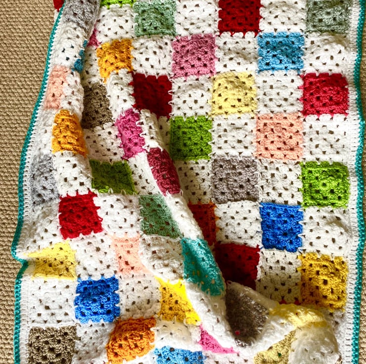 A cosy blanket in white and alternating coloured granny squares. Measures approx 32" x 29". Made with synthetic yarn which is warm and cosy but also machine washable. Suitable for use in the nursery, lap blanket, pushchair, doll.