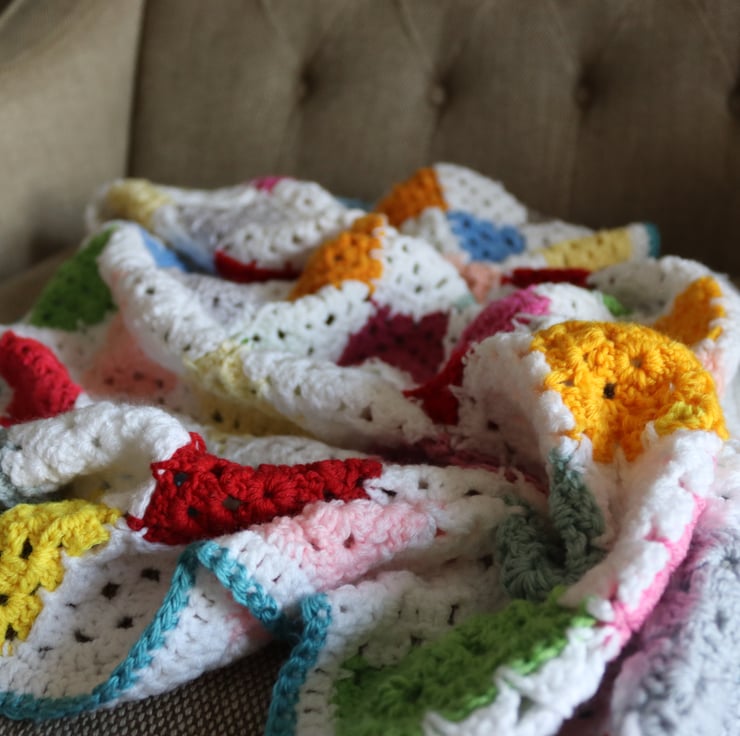 I had wanted to make a multi coloured blanket and love a granny square but i thought i would change it a bit by having colour blocks alternating with white. I have used a 'join as you go' method so that there is no need for stitching together which would impact on the overall desing.