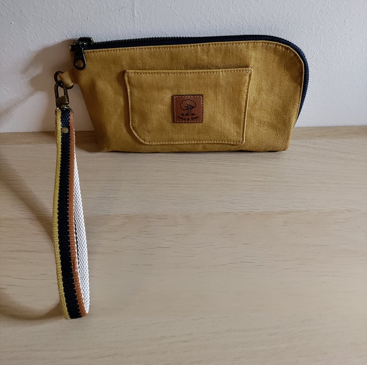 Cute but practical denim Wristlet. Removable strap. Zip closure and inside zip pocket and card slots. Front slip pocket, perfect for travel passes. Approximate size is 22 cm long, 3cm deep, 13xm high. Big enough to hold mobile phone, keys, pen.