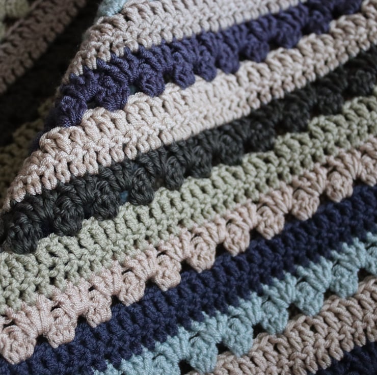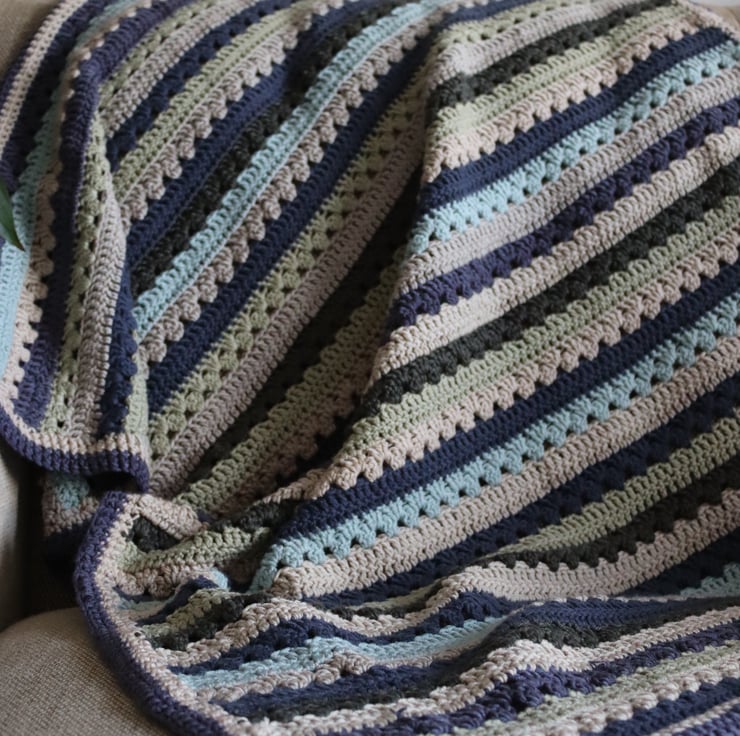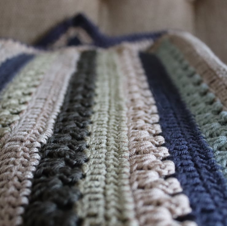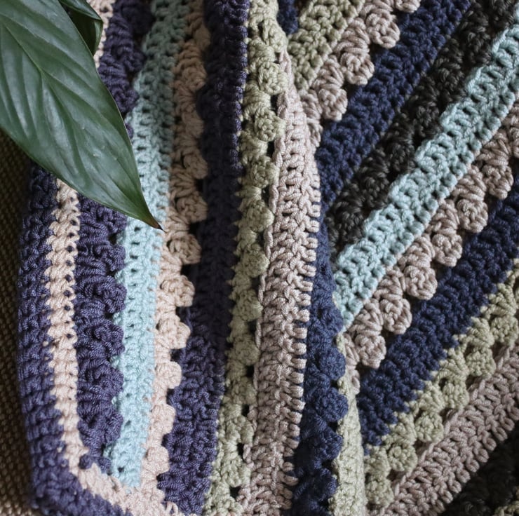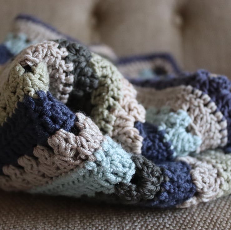 This crochet blanket is made with a super soft yarn with a lovely drape and weight. It is suitable for a lap blanket, for use in the nursery, bedroom or stroller. It measures approx 39" x 31". It can be machine washed and line dried. The colours have an earthy feel with greens, blues and cappuccino shades.