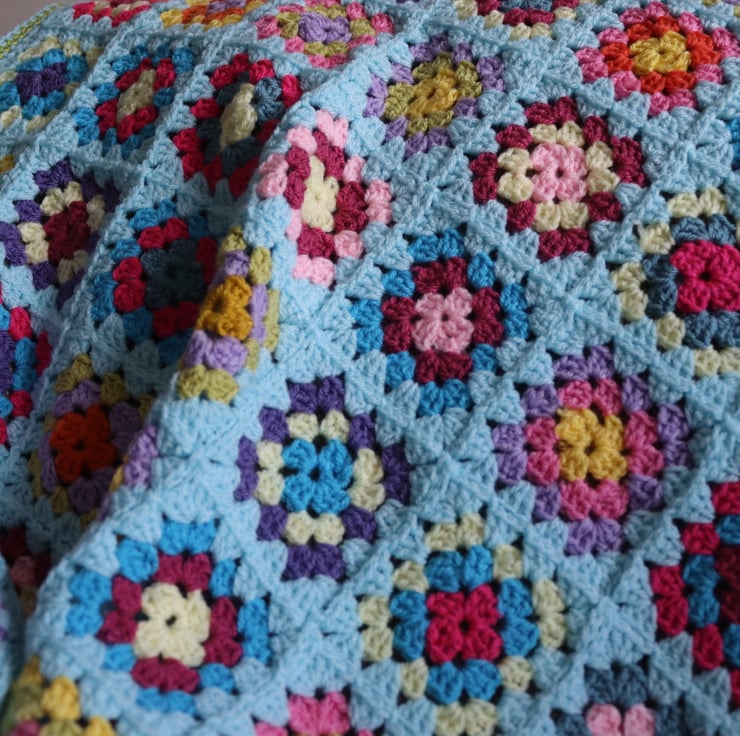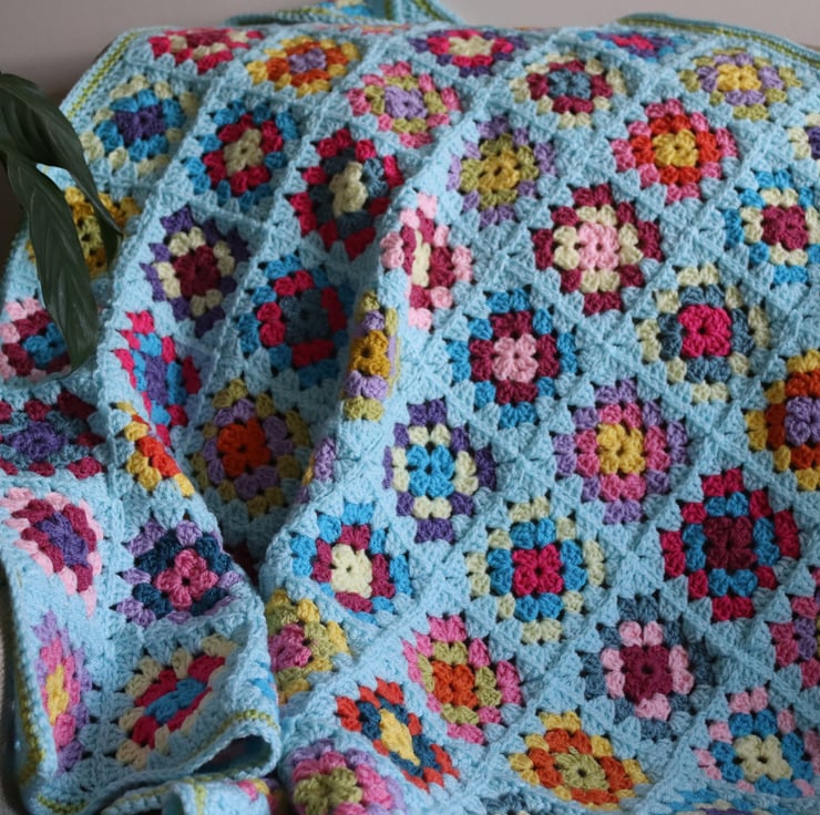 A crochet blanket made up of multi coloured granny squares finished with light blue with a light blue border. The blanket measures approx 33" x 32" and is made with an acrylic yarn which can be machine washed.