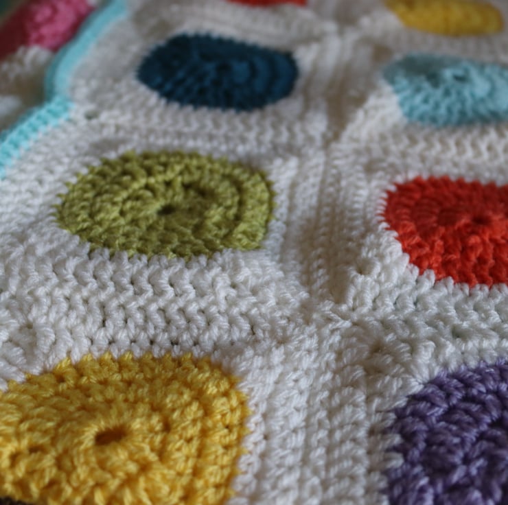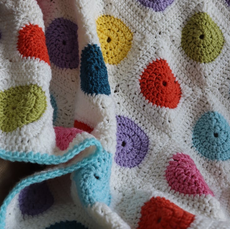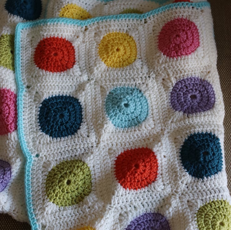 This blanket is made up of squares of white each with a coloured circular centre and is finished off with a border of turquoise. It measures approx 34" x 30" and is made with an acrylic yarn which is soft and warm but is super practical as it can be machine washed on a gentle wash. The blanket is suitable for the nursery for boy or girl, as a lap or pushchair blanket.