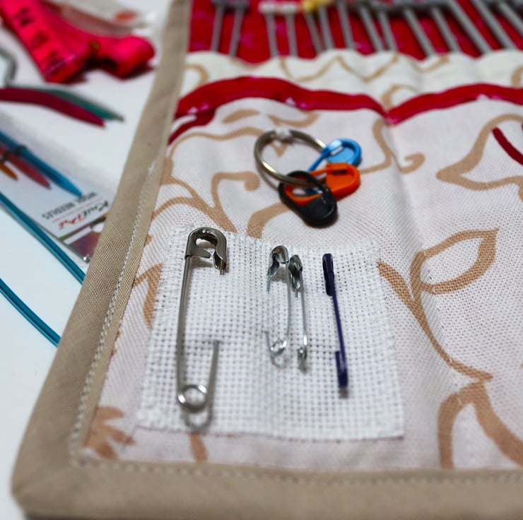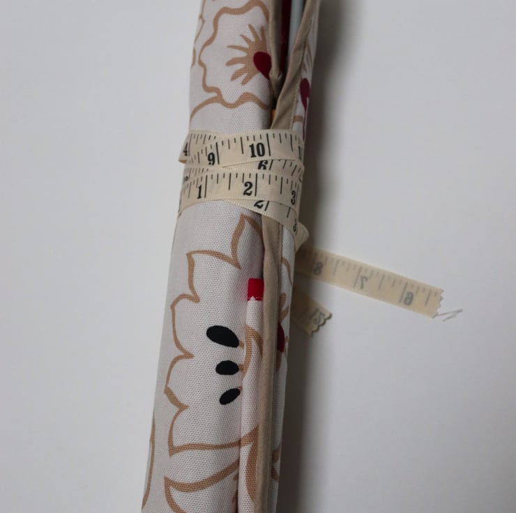 A hand made knitting needle roll made from re-purposed fabrics Included in the set are - Needles sized (all in mm and all pre owned) 2.75 3.00 3.25 3.75 4.00 4.50 5.00 5.50 6.00 7.00. Also a set of 4mm double pointed needles. An unused set of snips . 4 x Safety pins. 3 x different sized cable needles. An unused set of wool sewing needles. A pencil. A tape measure in metric and imperial. A knitting stitch holder. The case has pockets for the included items and some for your additional use. The top folds down to stop the needles falling out and it is secured with a fun tape measure style ribbon. The outside fabric is cream with beige and pink floral pattern and the inside is pink geometric pattern. Unfolded, the needle roll measure approx 16! high and 9.5! wide.