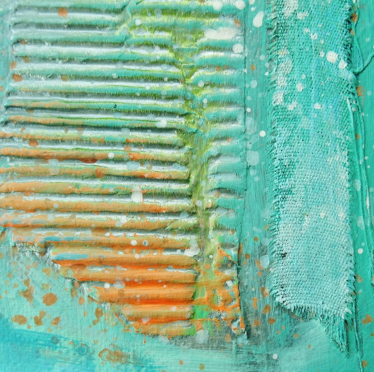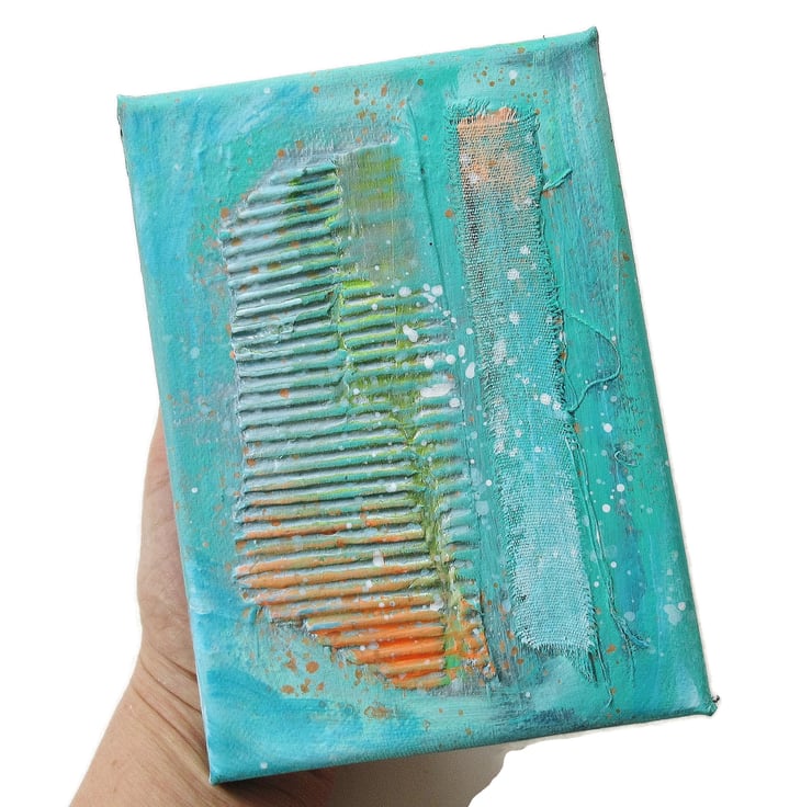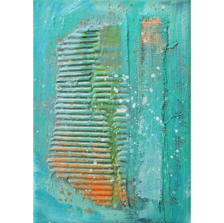 Small format painting in acrylic and collage, on 5 x 7 inch canvas, inspired by coastal themes and colours. The 0.75 inch canvas edges are painted so no framing is necessarily required, although you can, of course, still frame the artwork if desired, for further impact. In a rich bluey, greeny turquoise colour palette with peachy orange, with textured collage elements, and attractive and interesting paint splashes. Your artwork will be hand signed on the front by Bea before dispatch.