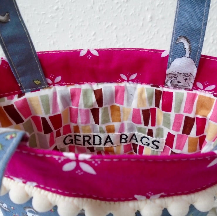 Made in a funky printed cotton fabric , and embellished with a cream pom pom trim on the front .