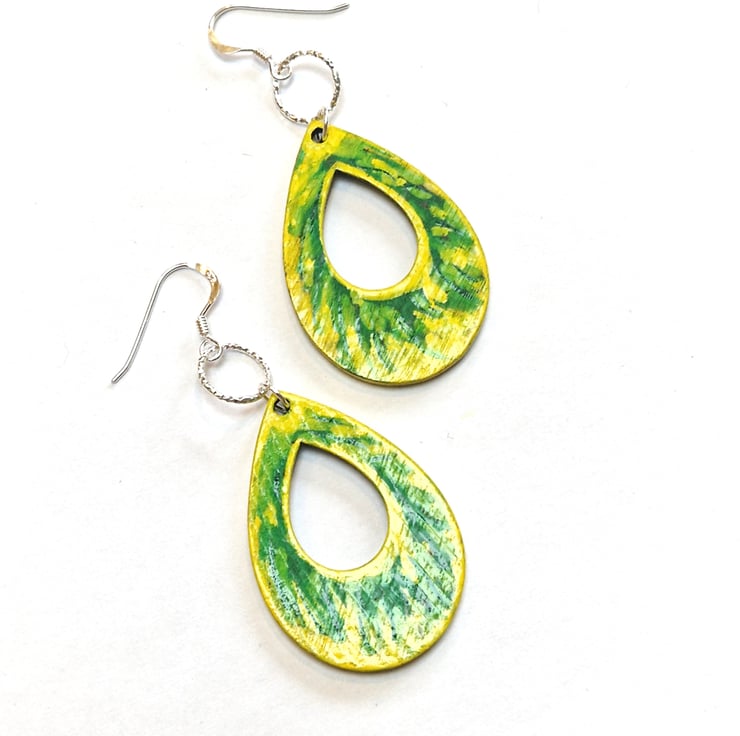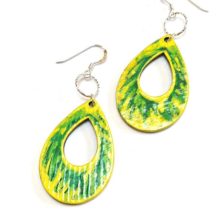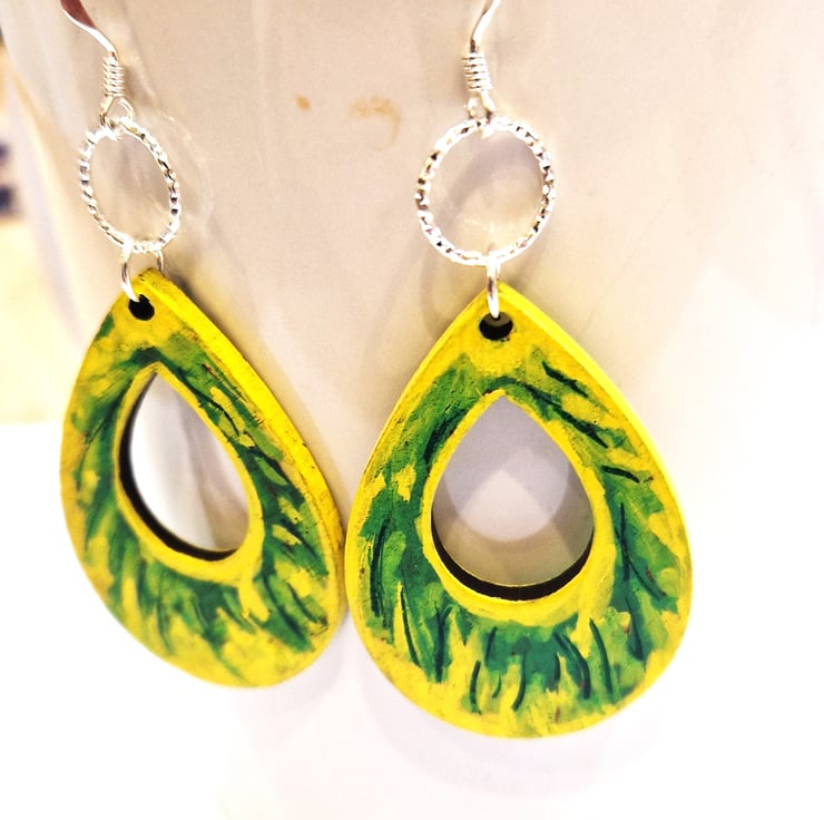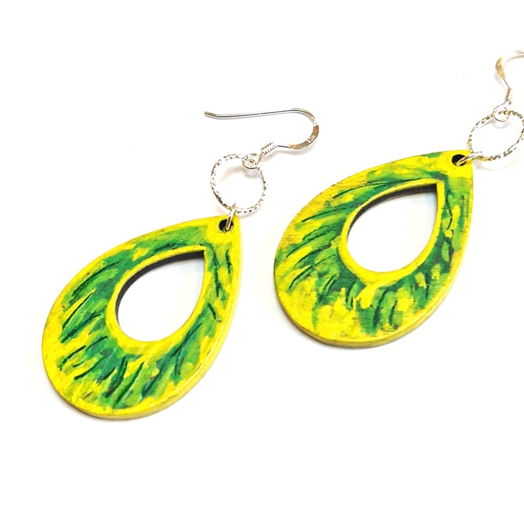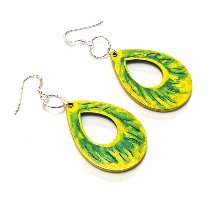 These earrings are teardrop shaped with a decorative sterling silver ring above, connecting to the ear wires. Each piece of wood is uniquely and brightly painted in an abstract design in green and yellow, reminiscent of foliage/grasses; a perfect Spring vibe.