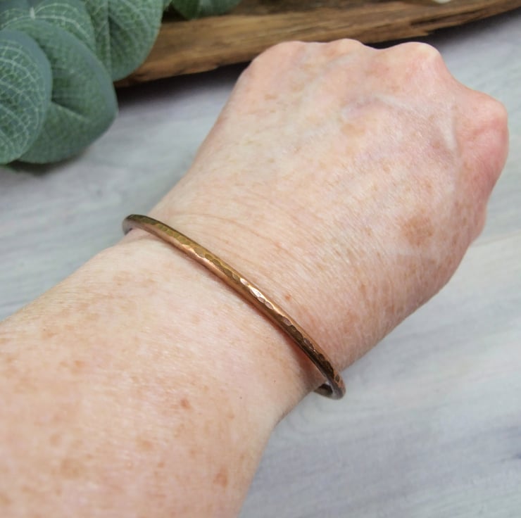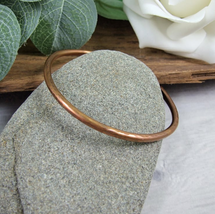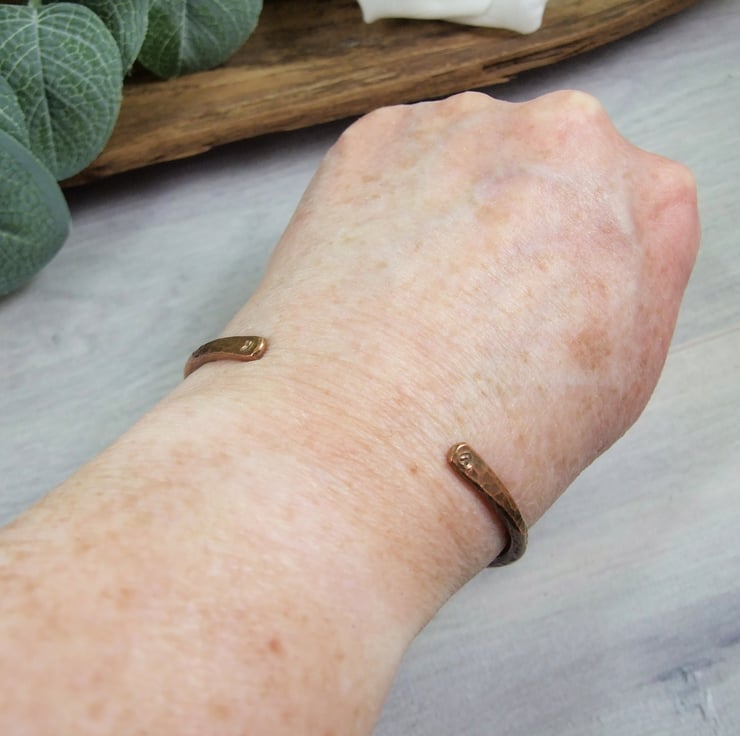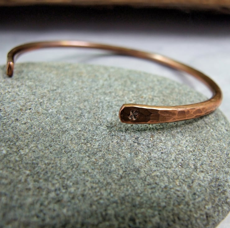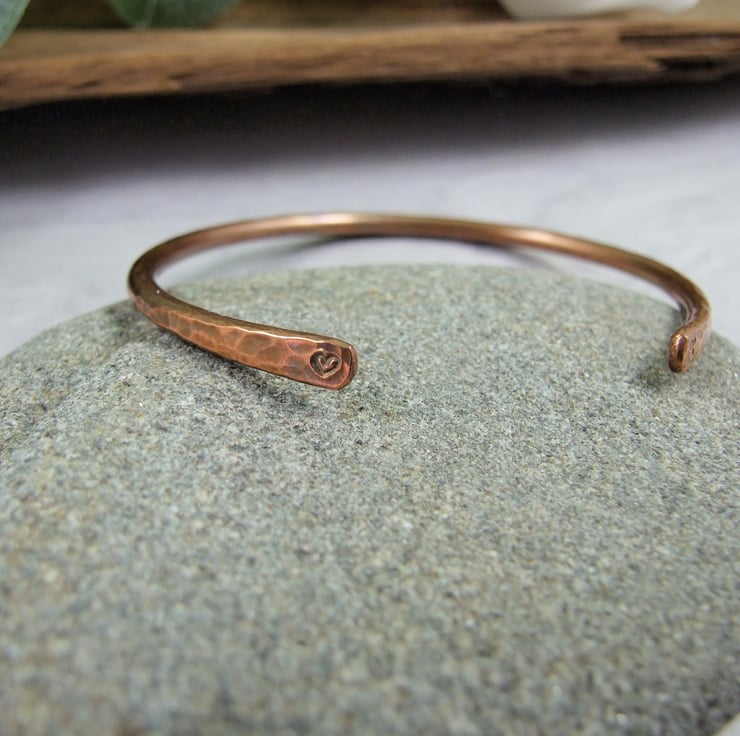 I have made the bangle from 2.6mm thick solid pure copper shaped and forged by hand and given a hamered textured finish at the ends I have hand stamped a tiny heart and 'x'.