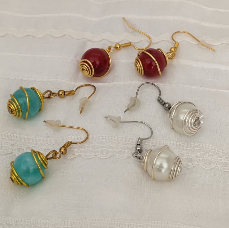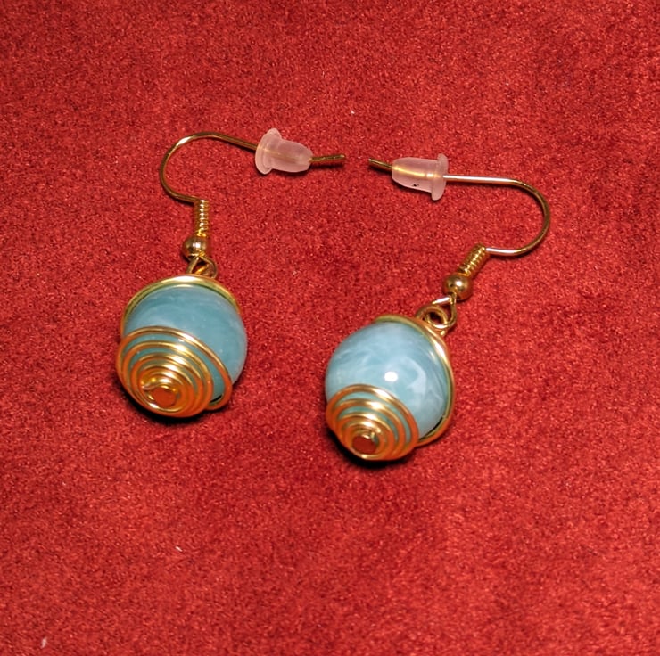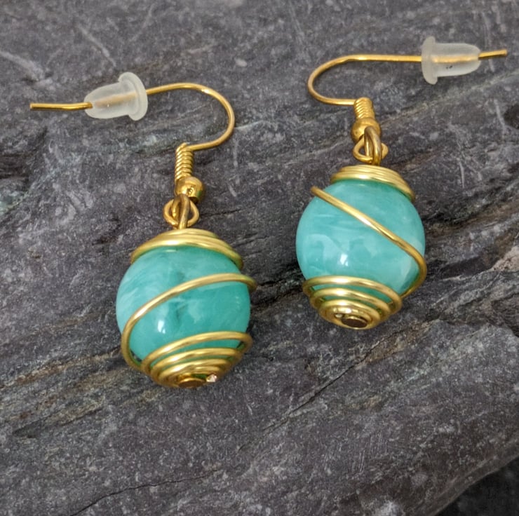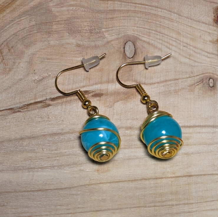 Turquoise glass beads wrapped in gold wire and attached to gold hooks with rubber backs.